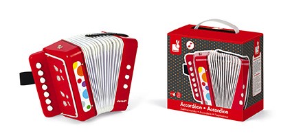 Acordeão de fole para crianças com uma cinta plástica para aprender música.