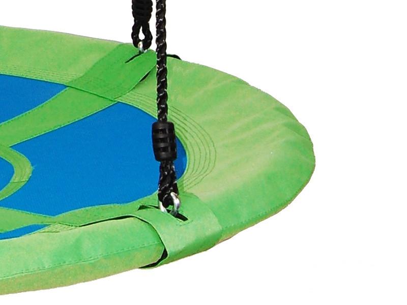 O diâmetro do assento do ninho é Ø 101 cm A espessura da tela é de 60 mm Corda trançada preta com soldas de polipropileno. As cordas são ajustáveis em altura. Tecido repelente de água com superfície de assento em malha de polietileno Aprovado para uso residencial. Peso máximo 150kg Para estrutura de balanço com altura de 1,80 a 2,40 m