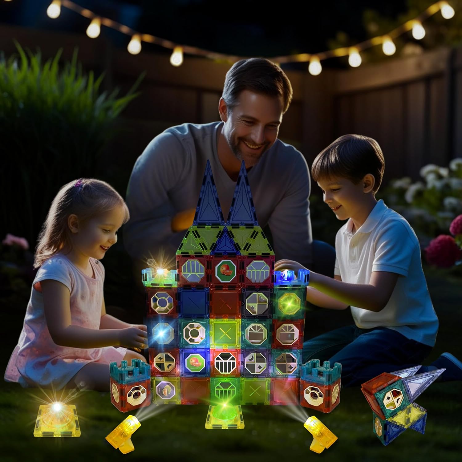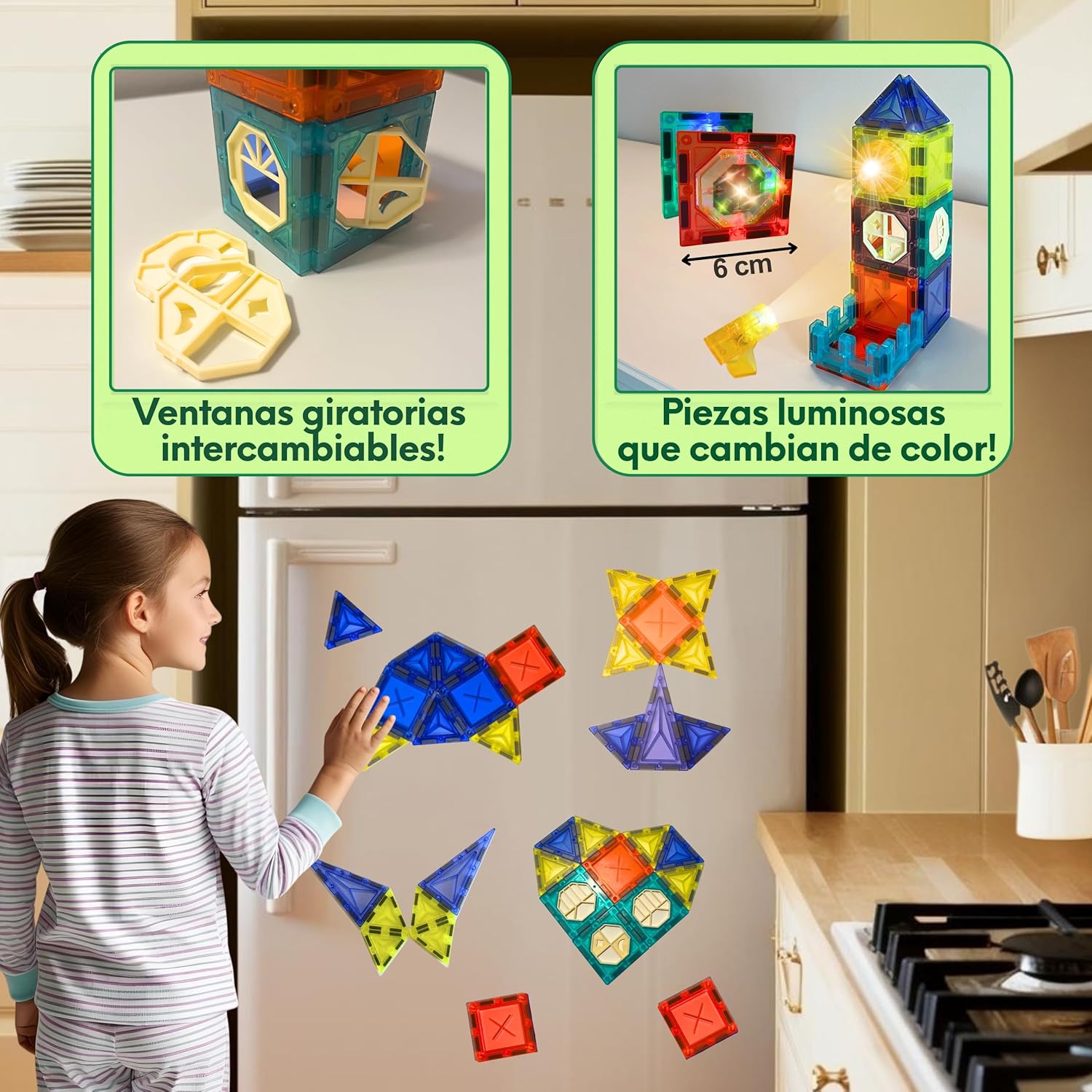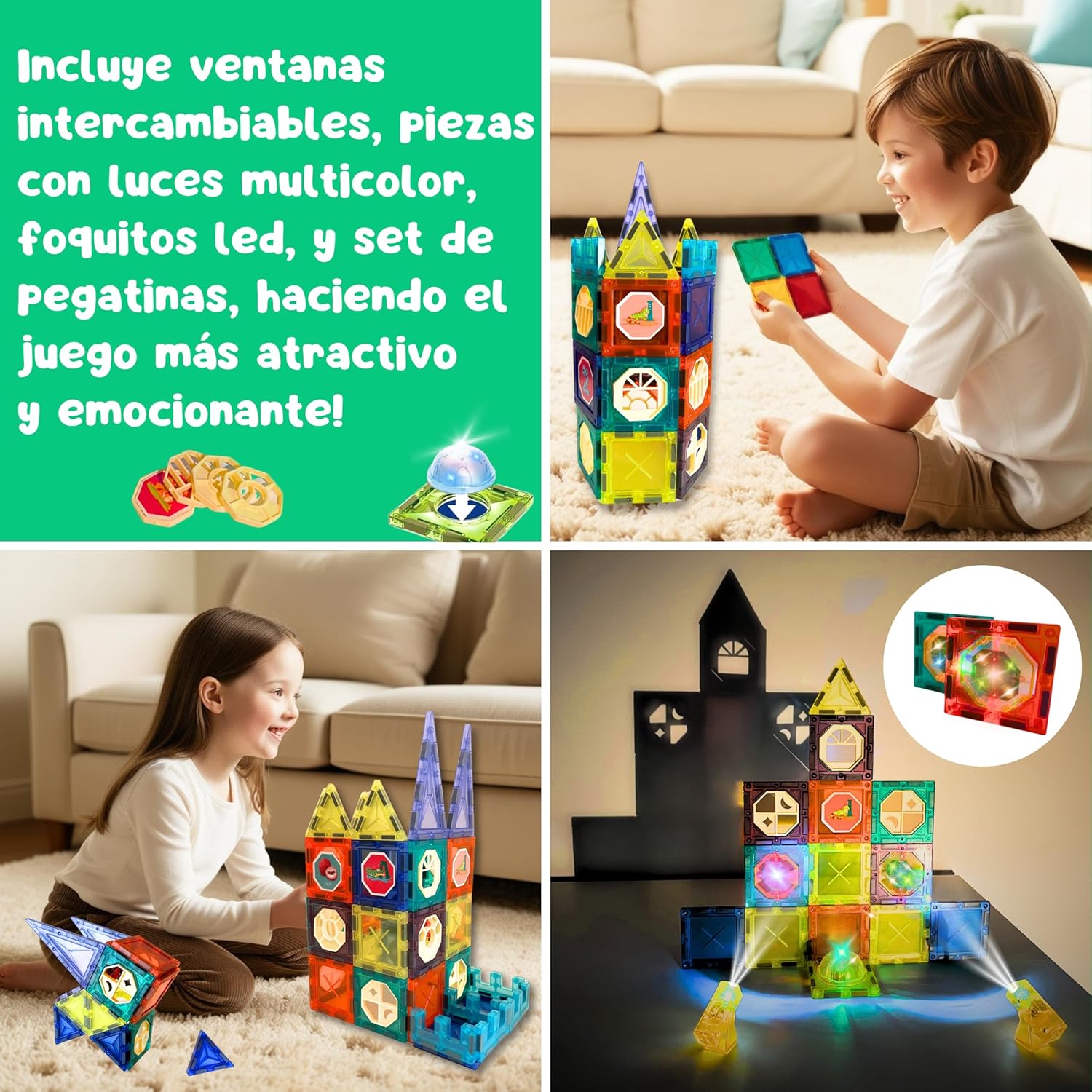 Acessórios luminosos surPrendentes: Conjunto de blocos magnéticos com várias peças luminosas que se encaixam nos blocos e acendem-se emitindo luzes que mudam de cor para espanto dos pequenos (pilhas incluídas para que possa ser usada imediatamente).