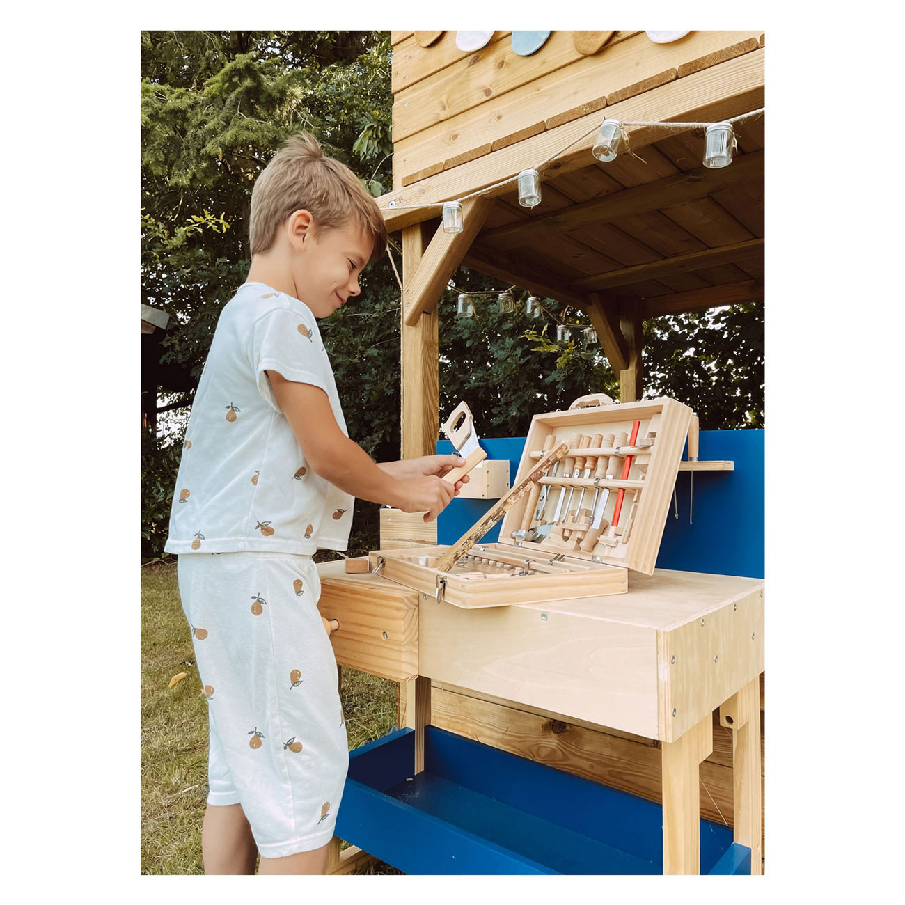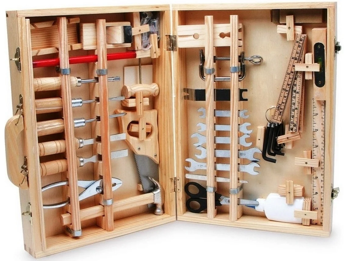 A caixa de ferramentas deluxe é o que há de mais moderno em nossa caixa de ferramentas: abas de madeira com trinta peças para pequenos bricolage!