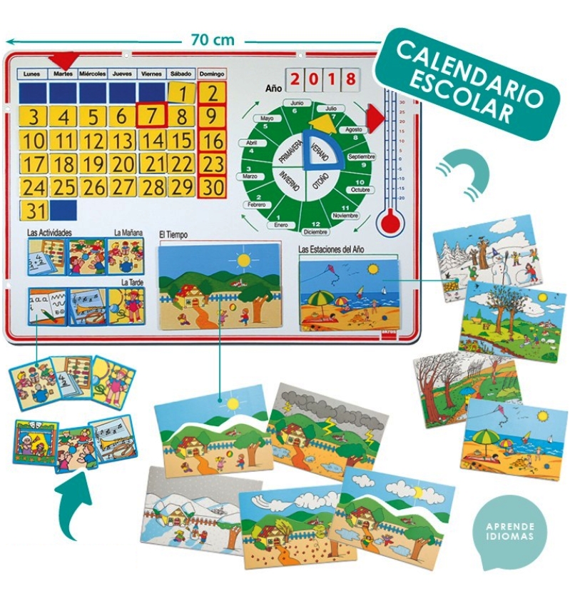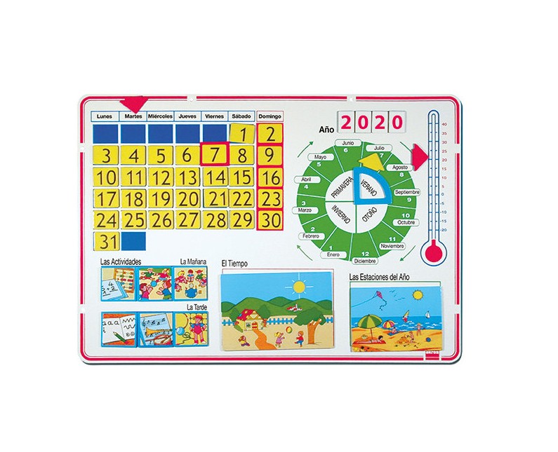 21. CONTEÚDO - UM PAINEL METÁLICO devidamente ilustrado para O CALENDÁRIO ESCOLAR. - QUATRO DESENHOS ILUSTRADOS representando cada uma das 4 ESTAÇÕES DO ANO - DEZASSEIS DESENHOS-PUZZLE com os quais é possível compor qualquer PAISAGEM CLIMATÉRICA. - 10 VINHETAS de ACTIVIDADES ESCOLARES- TRINTA E UMA FICHAS NUMERADAS de 1 a 31: os DIAS DO MÊS (+ 4 anónimas) - VINTE E DUAS FICHAS para compor O ANO, até 2021. (+ 3 anónimas) - TRÊS PEÇAS RECTANGULARES VERDES DE PLÁSTICO para colocar sob o cartão com data para indicar o DIA DO MÊS. - DUAS SETAS DE CARTÃO AZUL para indicar o DIA DA SEMANA na parte superior do Calendário - DUAS SETAS DE CARTÃO VERMELHO para indicar a TEMPERATURA no termómetro - DUAS SETAS DE CARTÃO AMARELO para indicar o MÊS no CÍRCULO DAS ESTAÇÕES. - DUAS SECÇÕES CIRCULARES DE CARTÃO AZUL para marcar a ESTAÇÃO no CÍRCULO DAS ESTAÇÕES. - TRÊS PEÇAS RECTANGULARES VERMELHAS DE PLÁSTICO para colocar no Calendário sob os cartões, com o número correspondente ao dos DIAS FESTIVOS. - UM GUIA PEDAGÓGICO E DE ACTIVIDADES- UMA BOLSA DE ÍMANES AUTOCOLANTES2. INSTRUÇÕES DE PREPARAÇÃO E DE UTILIZAÇÃO A)PAINEL MAGNÉTICO