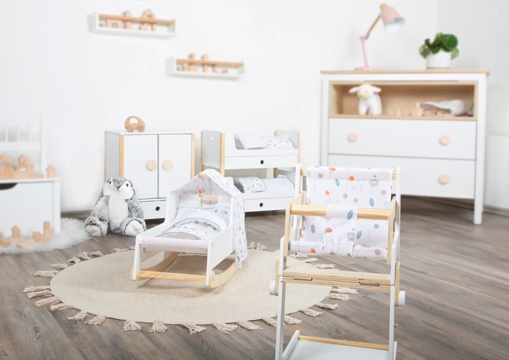 Até as bonecas têm que dormir! Este moderno berço de balanço destaca-se pelo seu design e funcionalidade simples, sóbrios e escandinavos. A roupa de cama reversível de gênero neutro e um edredom de grandes dimensões permitem que bonecas e bichos de pelúcia de até 18 polegadas durmam pacificamente sob o dossel. As pernas da cadeira de balanço e o dossel são removíveis, transformando o berço em uma espreguiçadeira elegante. Com um pequeno móbile e uma superfície de descanso em tecido firme. Este berço de boneca oferece uma adição elegante ao berçário com seu acabamento premium, construção estável, bordas arredondadas e elementos de madeira maciça visíveis. O berço de boneca faz parte da série de produtos "Little Button", que impressiona com seus elementos de design recorrentes, sua linguagem de forma reta e sua coloração discreta. Todos os móveis de boneca criam uma imagem geral harmoniosa e garantem um prazer de brincar duradouro. Um item exclusivo e indispensável para sua variedade de bonecas e dramatizações.