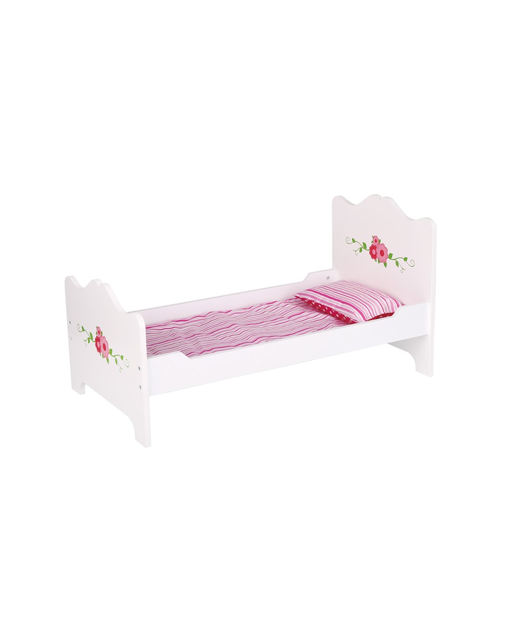 Cama de madeira branca com decorações florais. Colchão e travesseiro reversíveis.