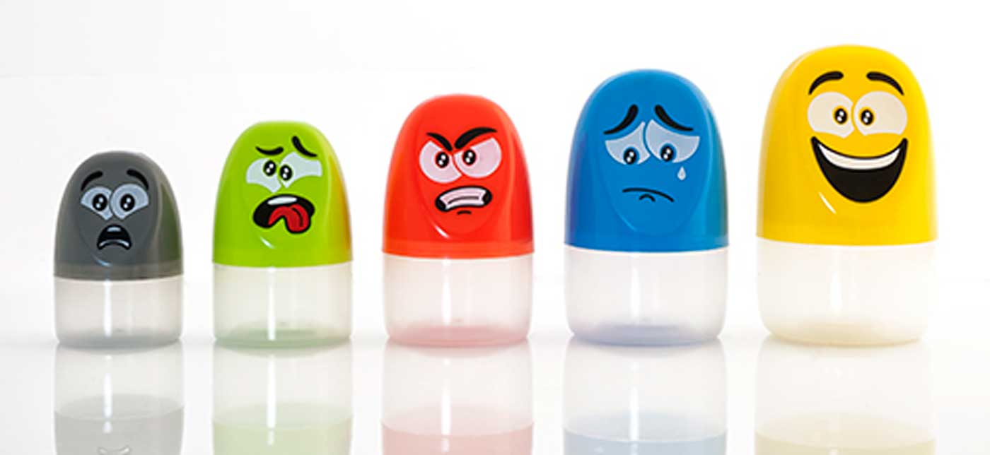 Cinco emoções básicas representadas em cinco cápsulas dentro das quais podem ser armazenados desenhos ou objetos relacionados a cada uma delas. Inclui: