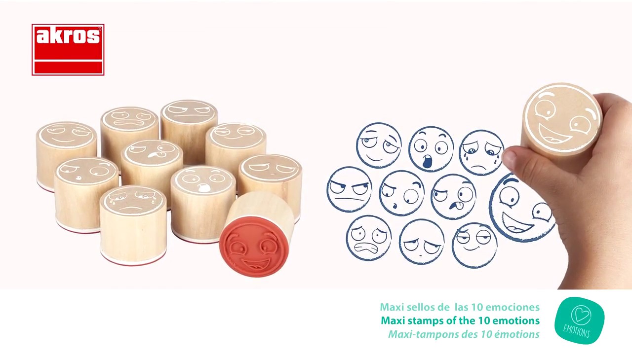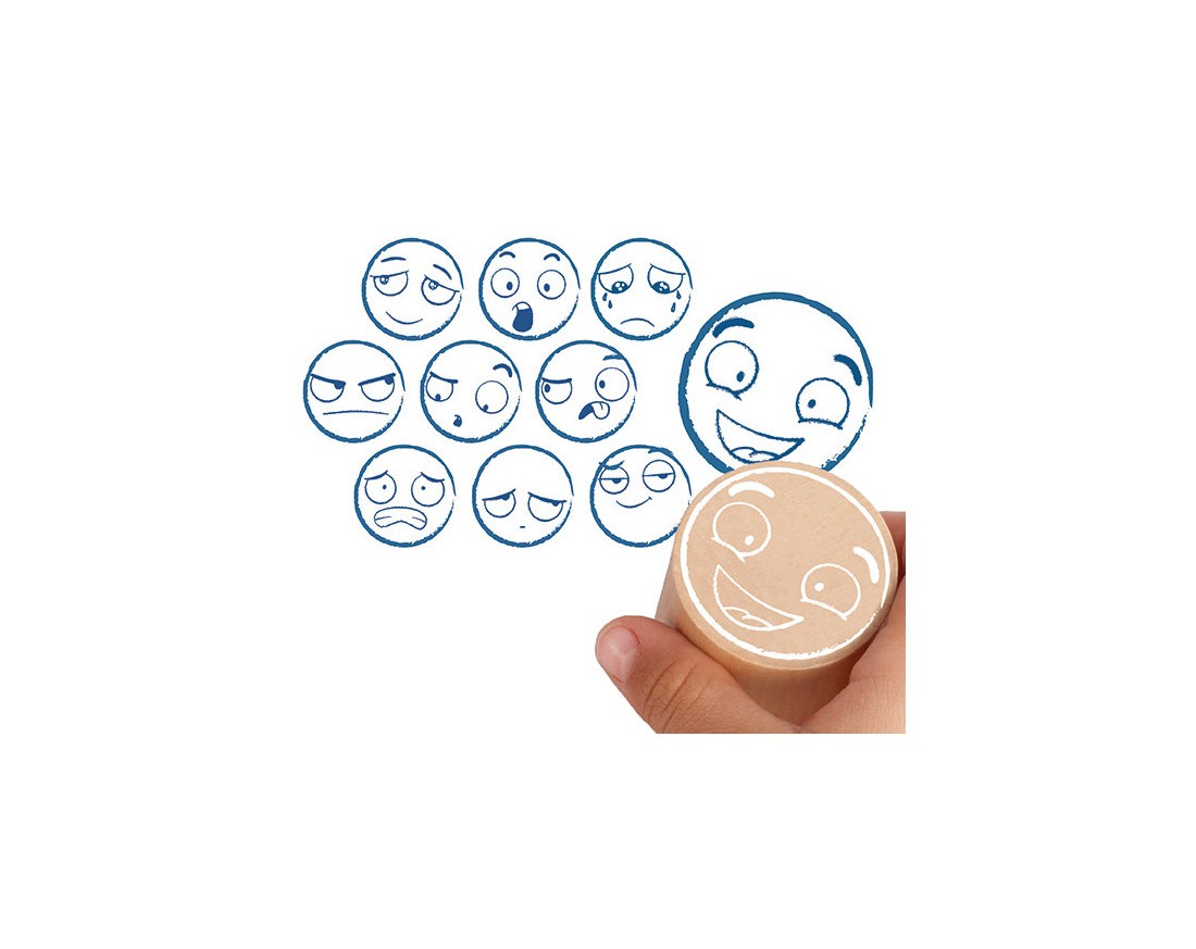 Conjunto de 10 grandes carimbos para representar e brincar com as 10 emoções básicas que norteiam o nosso comportamento: alegria, autoconfiança, admiração, curiosidade, surpresa, raiva, nojo, tristeza, medo e culpa.