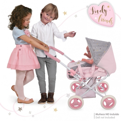 Com o carrinho para bebés 3 em 1 Lovely Friends da CB Toys, poderás passear o teu boneco pelo parque como a mãe faz! Carrinho: barra de 56,5 cm de altura com agarre acolchoado, inclui 1 cesta de tela extraível para guardar os acessórios, se dobra fácilmente Alcofa: de tela e com 2 asas para transportar facilmente, desenhado para bonecos de 48 cm aprox, podes retirar a alcofa e levar para onde queiras! Cadeira: com cinto ajustável para agarrar ao bebé da forma mais segura, se pode inclinar de forma individual o cabeçal e os apoios para os pés Padrão doce e mimoso em rosa e cinza, brinquedo simbólico recomendado a partir de 3 anos, promove o desenvolvimento emocional, a imaginação e a socialização