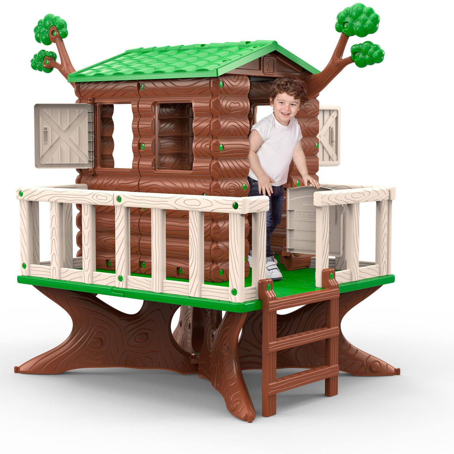É elevado como uma verdadeira casa na árvore, e tem um grande espaço interior com 4 janelas, 1 porta, escadas e um corrimão…