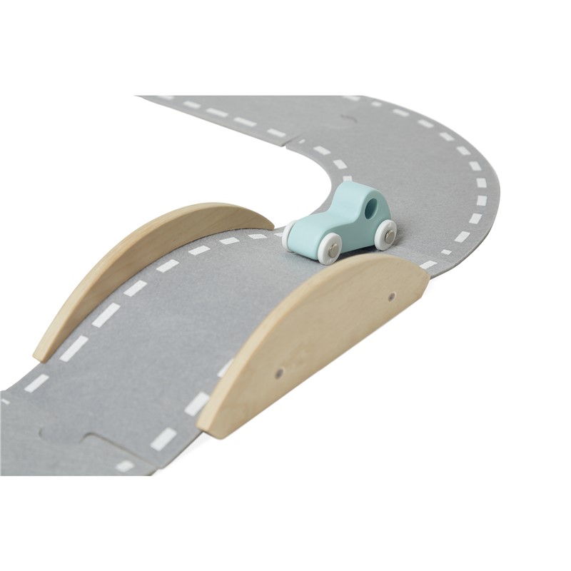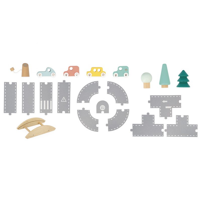 Super circuito composto por 21 peças: 12 peças de feltro que juntas formam um grande circuito e 9 acessórios de madeira: 4 carros, sendo um deles 1 carro elétrico (falso), 1 posto de recarga, 3 árvores e 1 ponte.