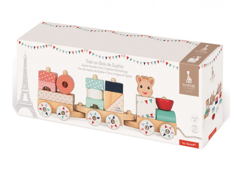 Choo! Choo! Siga Sophie la girafe em suas aventuras com este trem incrível. Dá aos teus filhos dois brinquedos em um com um trem de madeira para construir, composto por 3 carrinhos para desenvolver a imaginação do seu filho e um brinquedo de puxar para promover suas habilidades motoras.