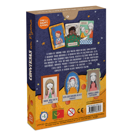 Conversas em Pijama é um convite a cuidar desse momento tão especial. Dentro da caixa vais encontrar um livro e 30 cartas ilustradas que ajudam a abrir espaço para a conversa, a imaginação e a conexão. Cada carta traz uma pergunta ou sugestão para conversar com a criança de forma tranquila, num ambiente seguro e sem pressas.