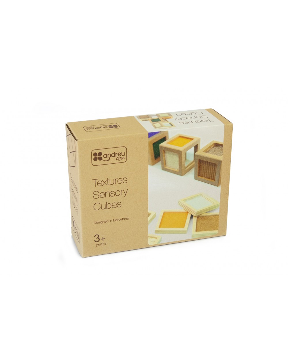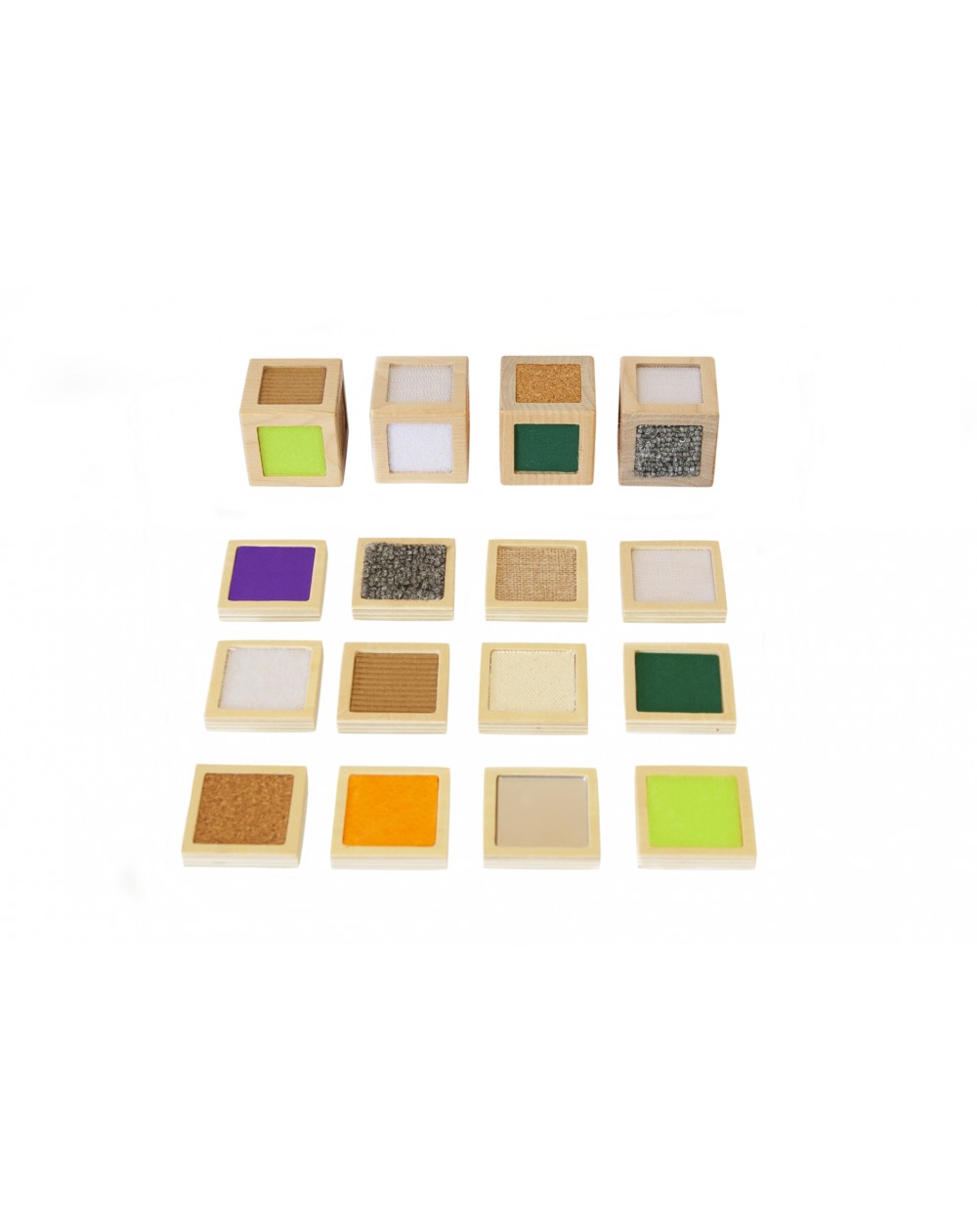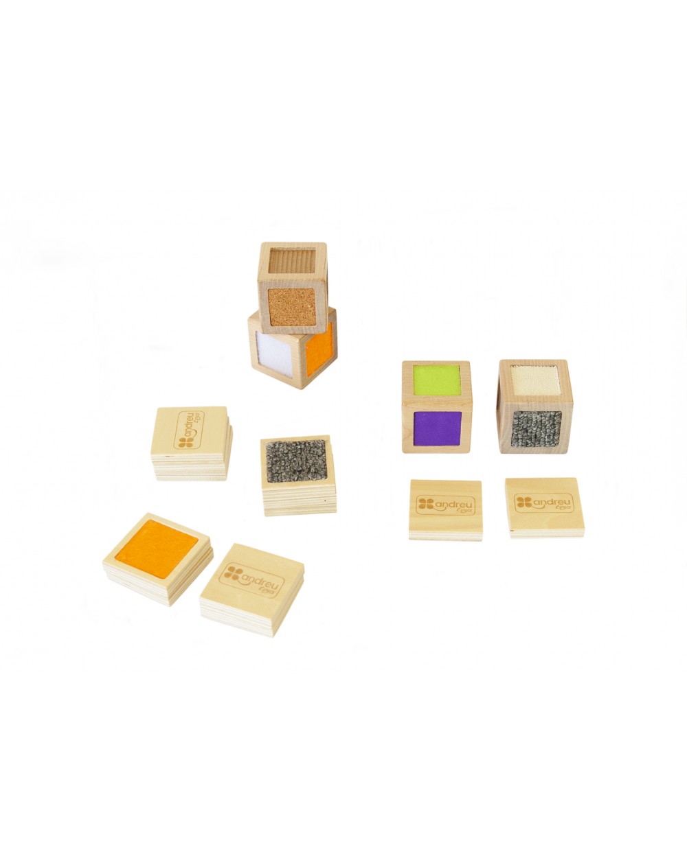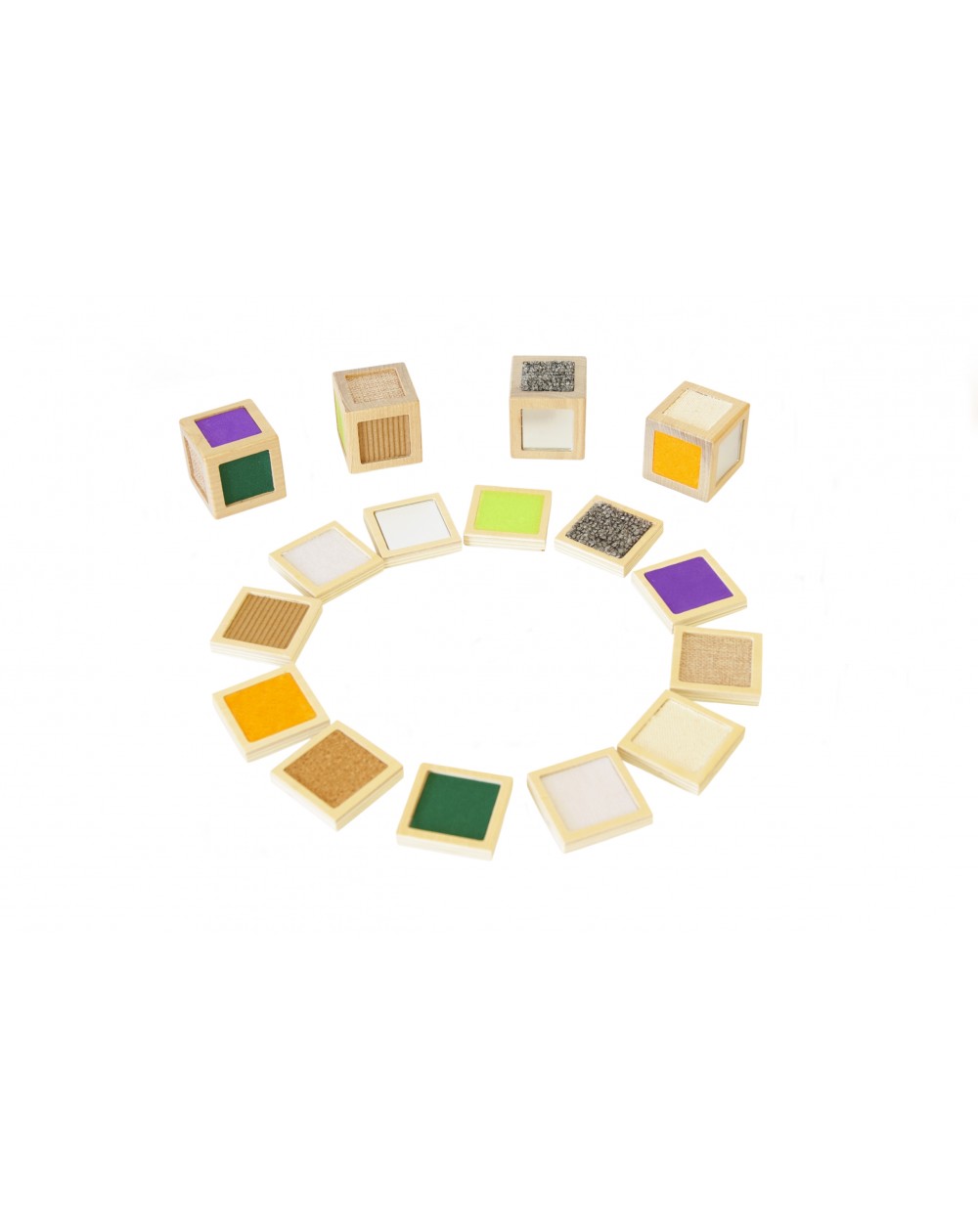 4 cubos de madeira com texturas e 12 peças táteis.