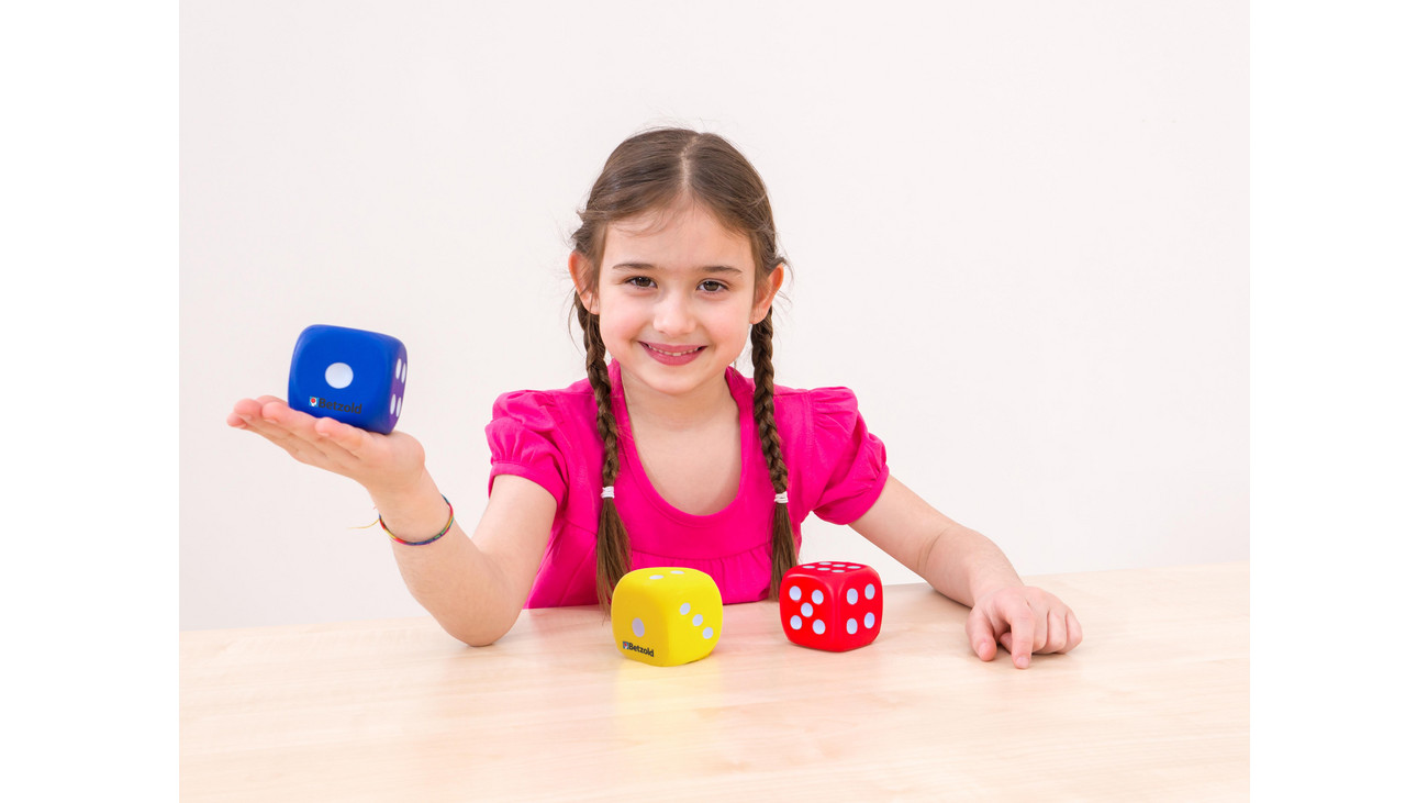 Os cubos de espuma possuem um revestimento altamente flexível que protege a espuma. As crianças aprendem a jogar dados na mesa.
