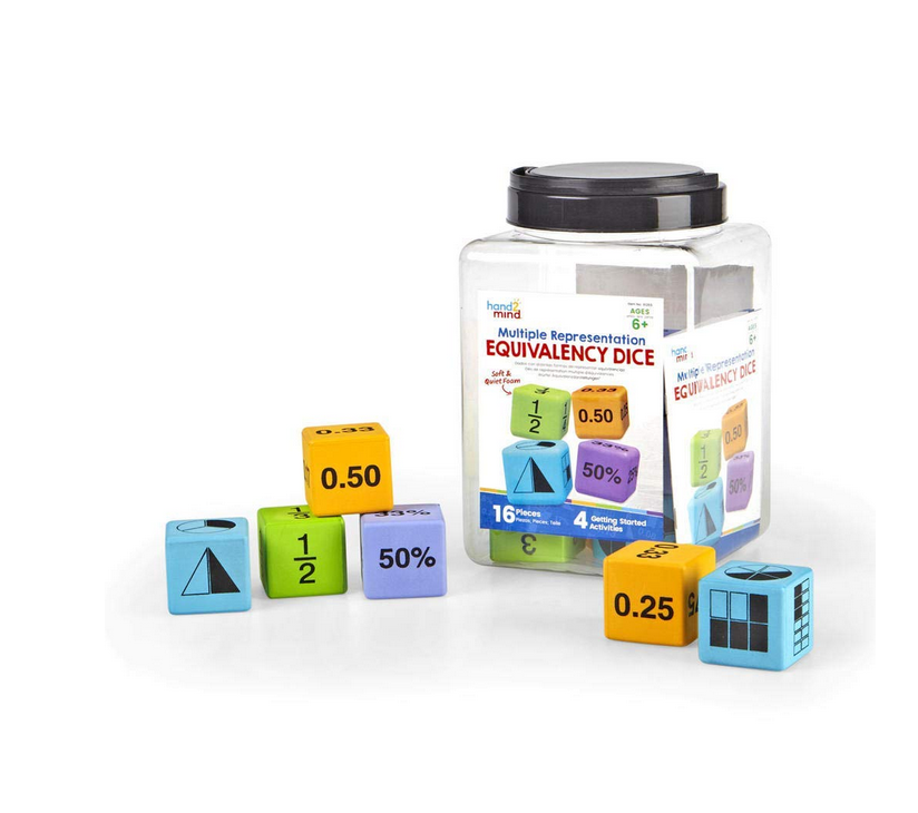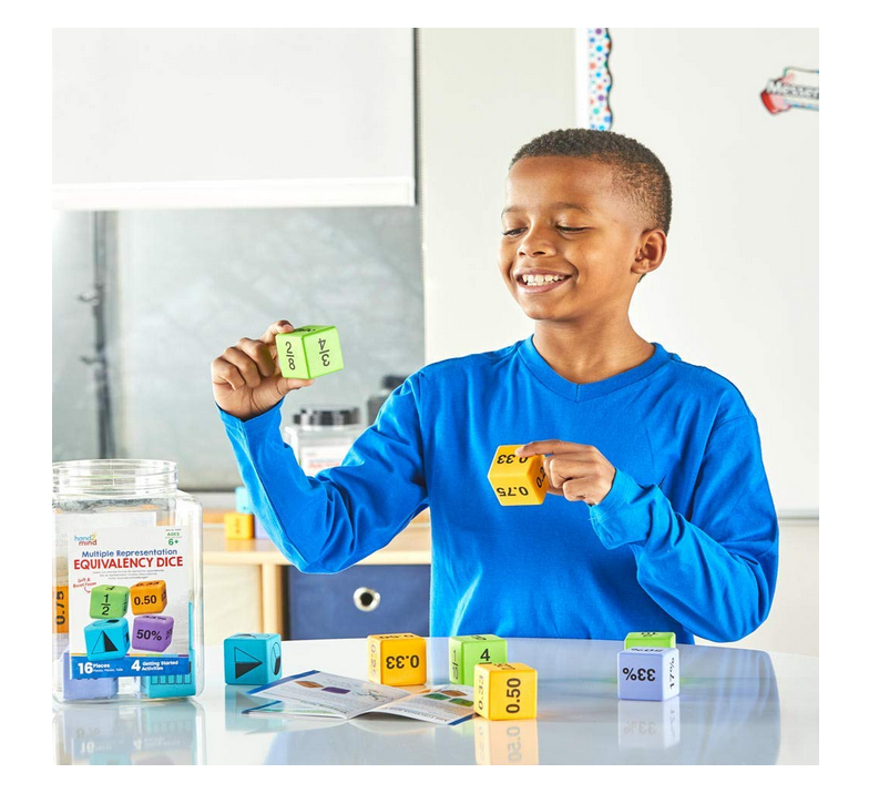 Os dados de cores atraentes fornecem às crianças um recurso prático de aritmética para que possam visualizar as relações estabelecidas entre frações, decimais e percentagens.