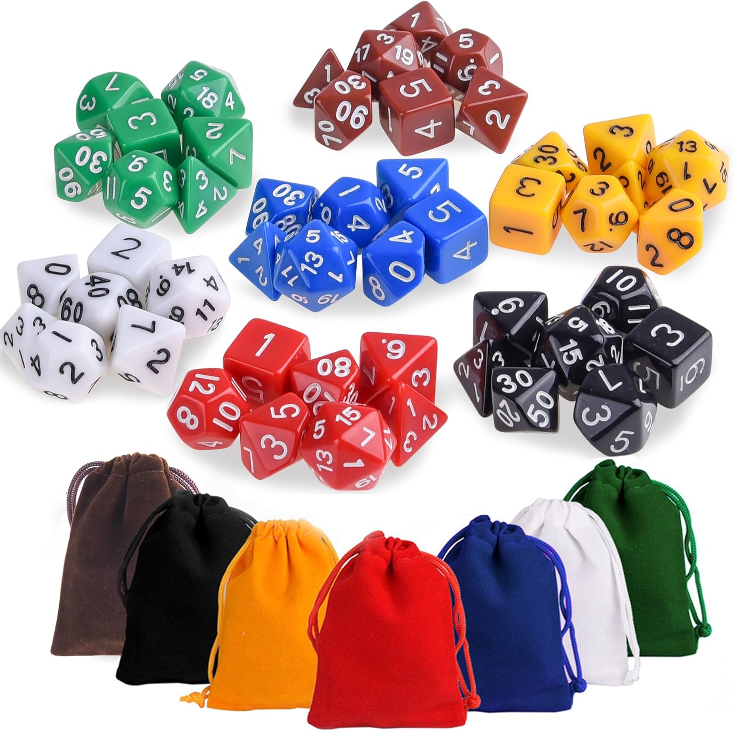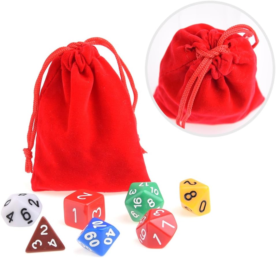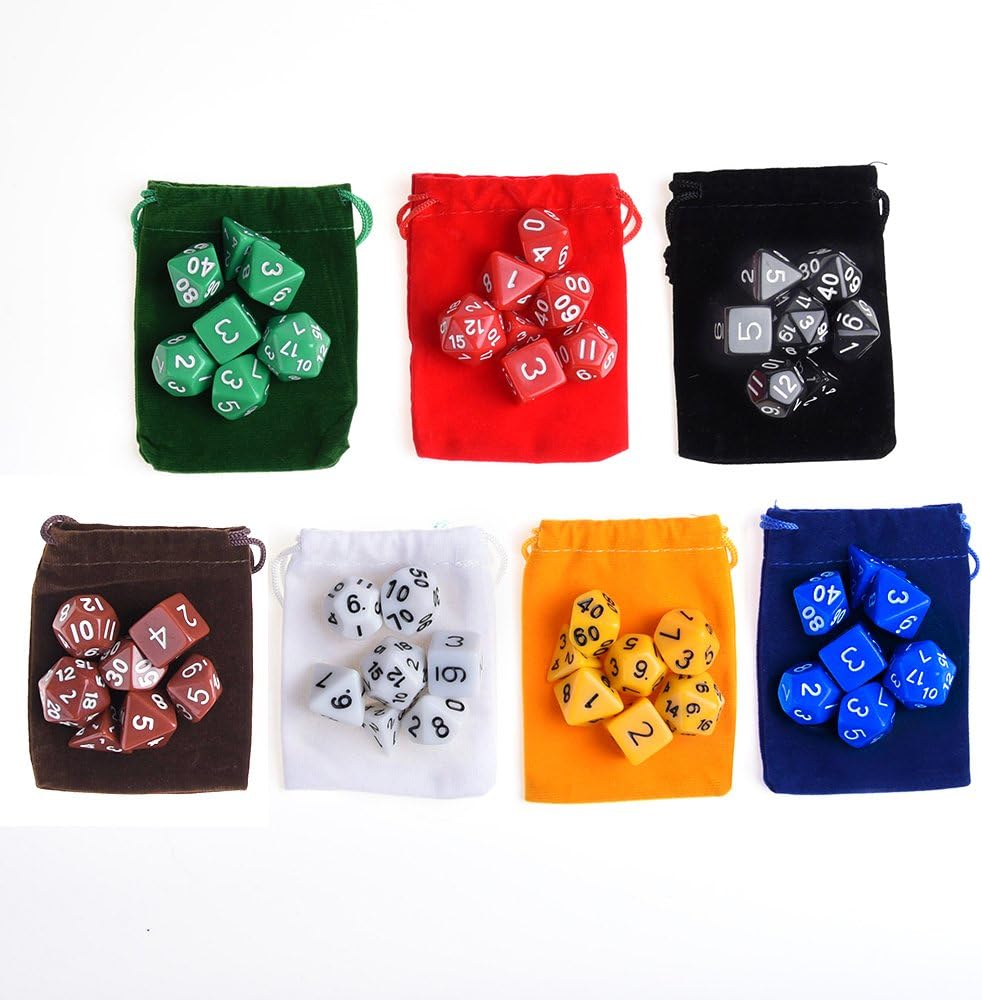 Conteúdo da embalagem: 49 dados poliédricos em 7 conjuntos completos, 7 sacos de dados. 7 variedades de dados (de 4 lados, 6 lados, 8 lados, 10 lados, 12 lados, 20 lados e um dado "%" ) estão incluídos em cada um dos 7 conjuntos de cores e nos seus próprios saquinhos individuais para mantê-los separados e codificados por cores. Cor: 1 * conjunto de dados pretos 1 * conjunto de dados azuis 1 * conjunto de dados verdes 1 * conjunto de dados de café castanho 1 * conjunto de dados vermelhos 1 * conjunto de dados brancos 1 * conjunto de dados amarelos 7 * sacos de dados