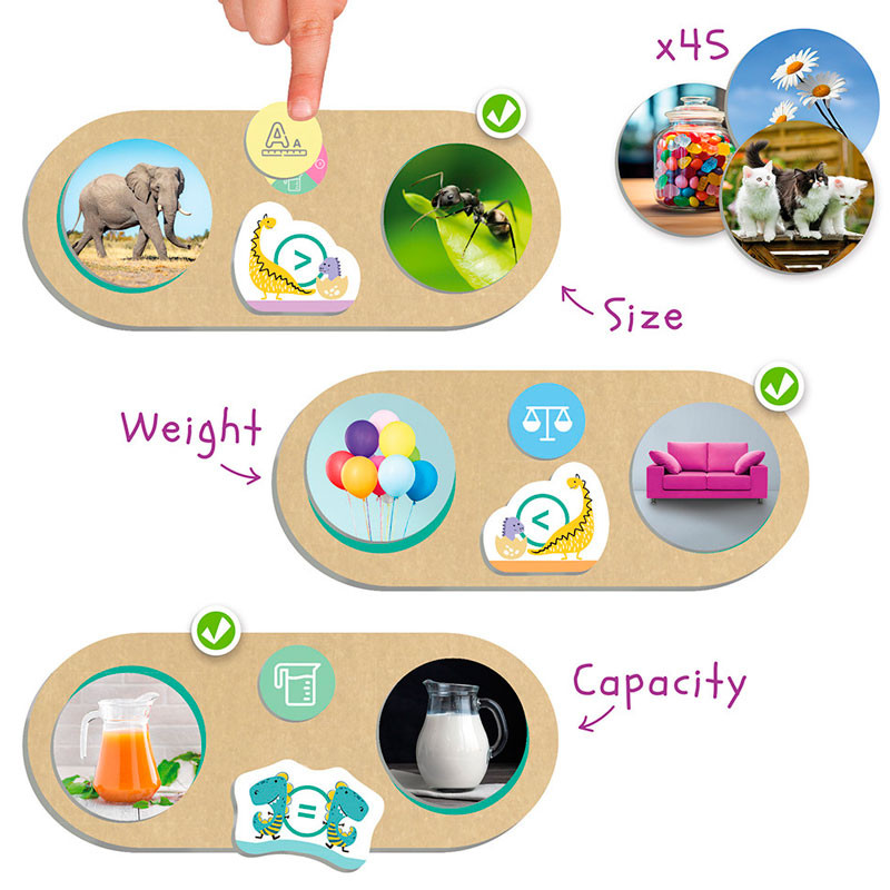 É um recurso ideal para melhorar a atenção, concentração e raciocínio lógico, promovendo o aprendizado de comparações matemáticas de forma simples e divertida.