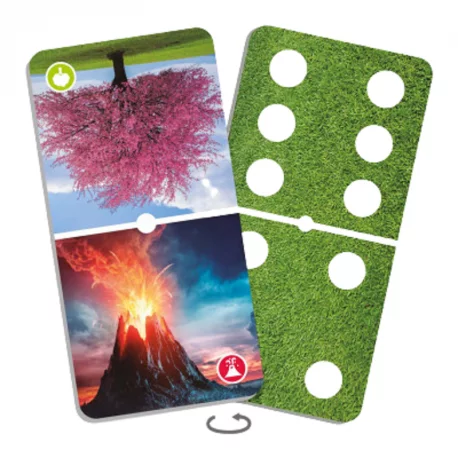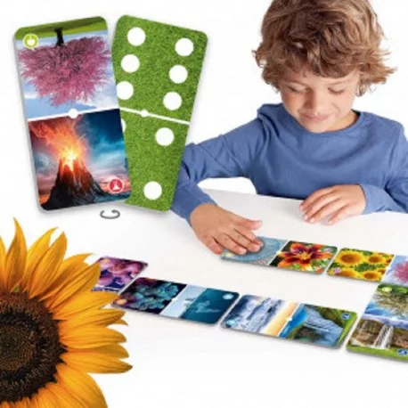 Grande dominó reversível para descobrir as maravilhas da natureza: combine e explore fotos de árvores, flores, vulcões, corais, etc.