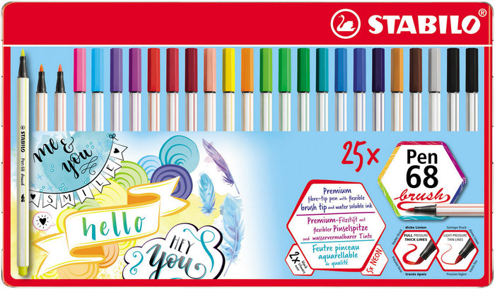 Estojo Metalico C/25 Cores Stabilo Pen 68 Brush Ponta Pincel 6171