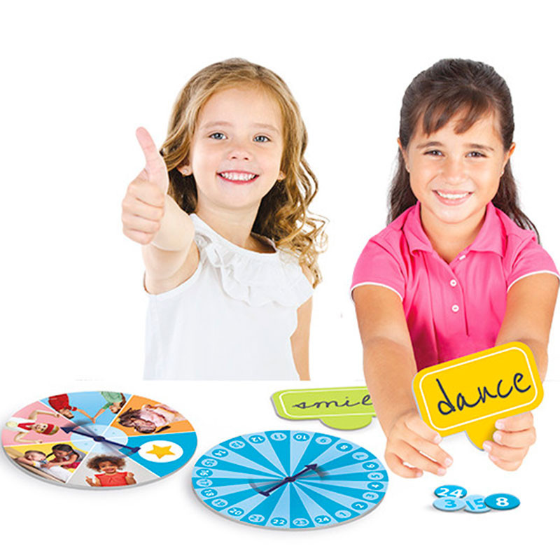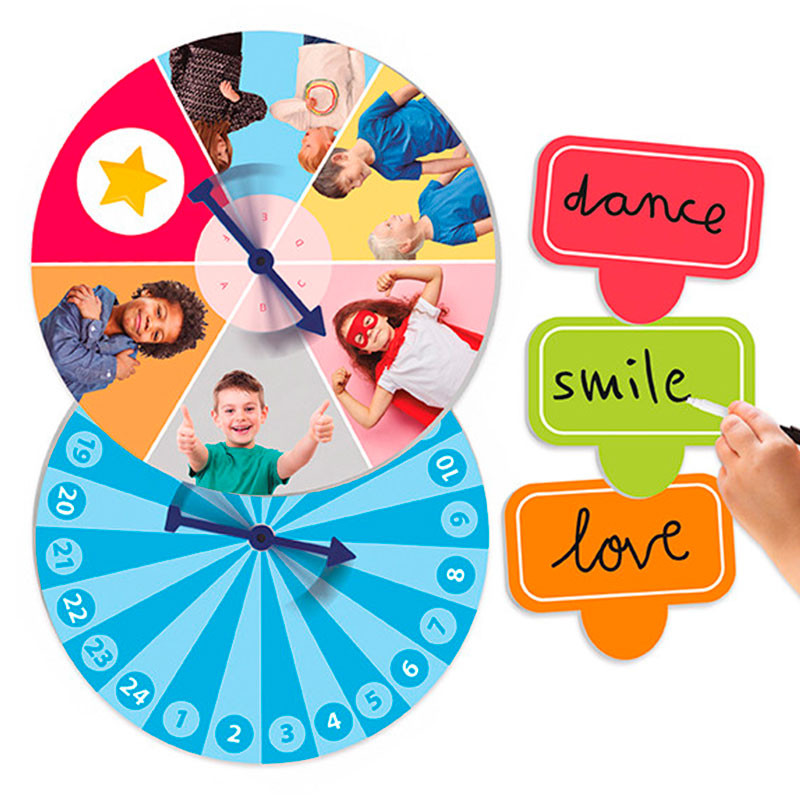 3 spinners de papelão fortes (18 cm) 24 balões de fala regraváveis feitos de papelão resistente (10 x 8 cm) 24 balcões circulares de cartão resistente (3 cm) 12 marcadores apagáveis