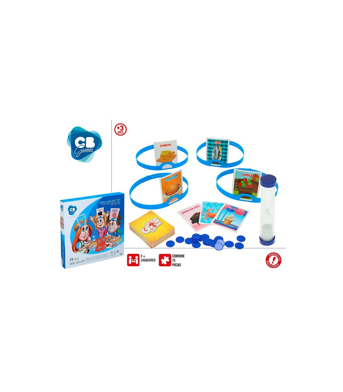 Damos uma dica: é um alimento! Inclui 75 peças: 4 viseiras reguláveis para colocar a carta, 1 ampulheta, balcões para contar os pontos e muitas cartas de comida!