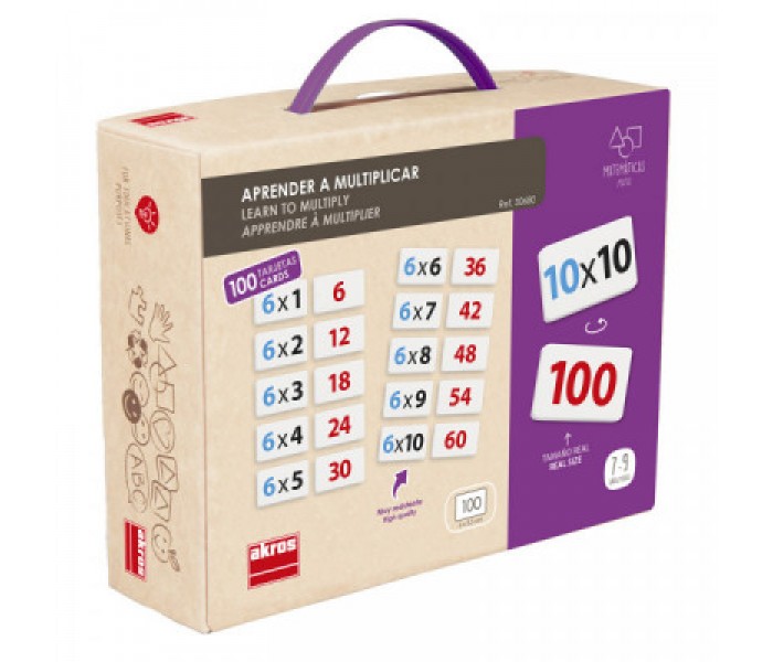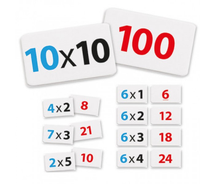 100 cartas impressas em ambos os lados, uma com o multiplicando em azul e o multiplicador em preto, e do outro lado o resultado em vermelho.