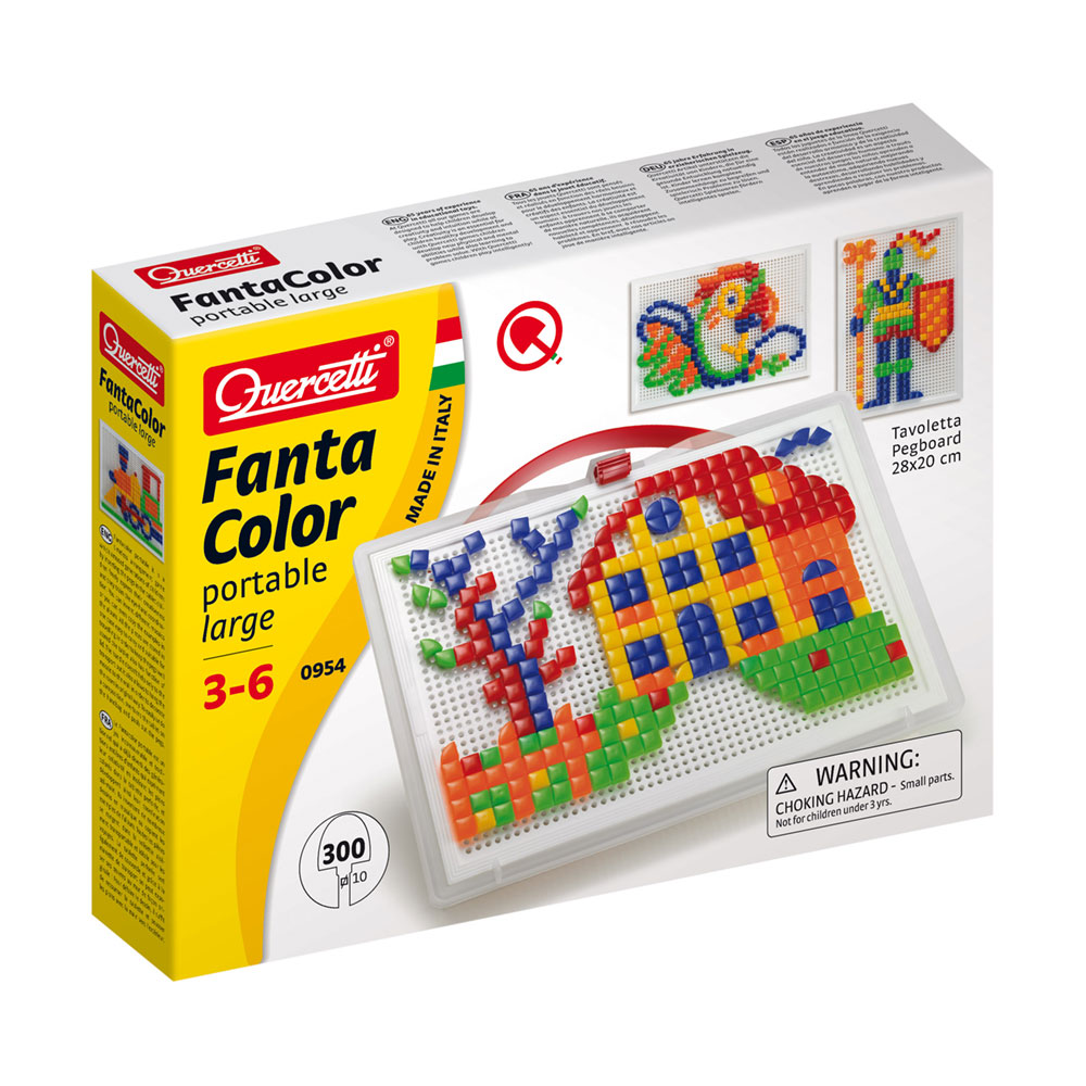 Fantacolor portátil é um jogo intemporal que divertiu gerações, incentivando-as a expressar livremente a sua criatividade enquanto treinam a sua coordenação motora. O conjunto inclui uma caixa com alça cuja tampa é na verdade o tabuleiro do jogo, onde podem inserir pinos de diferentes cores para inventar mosaicos ou simplesmente copiar os exemplos dos cartões fornecidos. Um jogo particularmente indicado para crianças em idade pré-escolar, onde estas poderão trabalhar ativamente na sua capacidade de observação e destreza.
