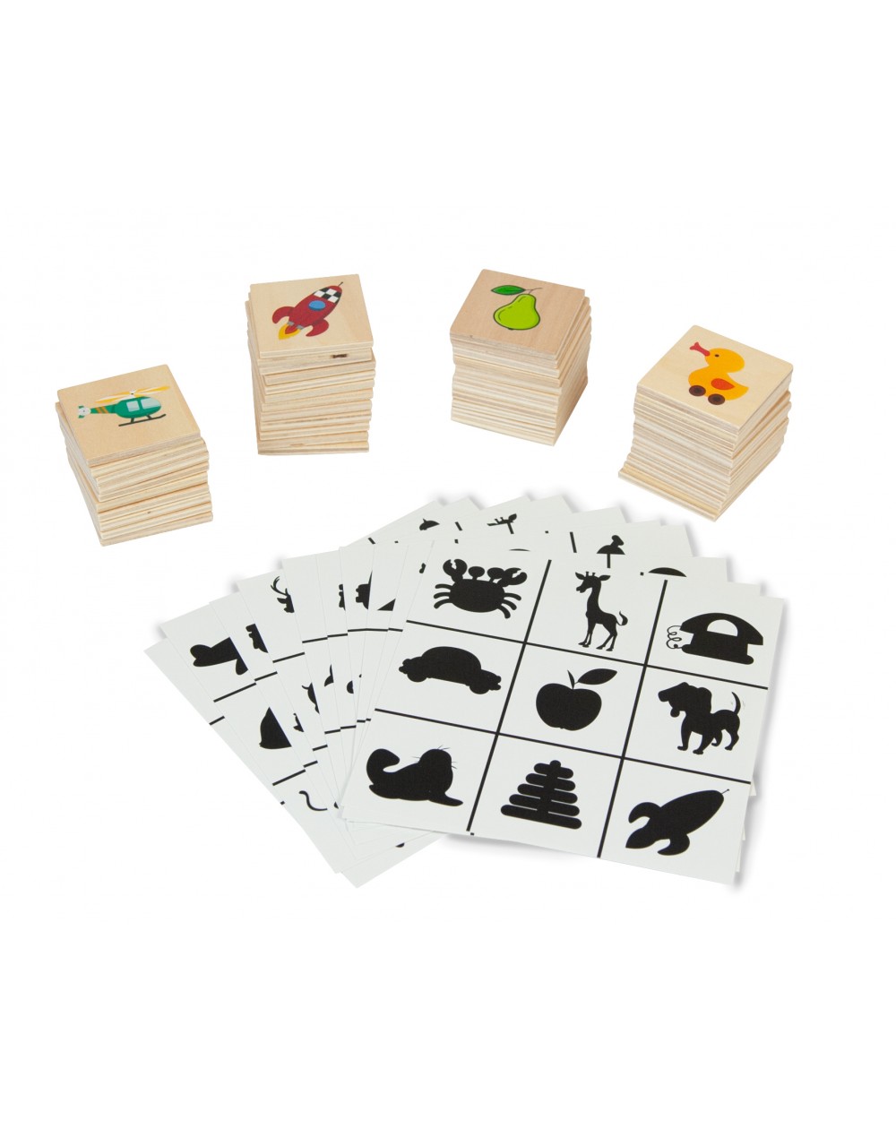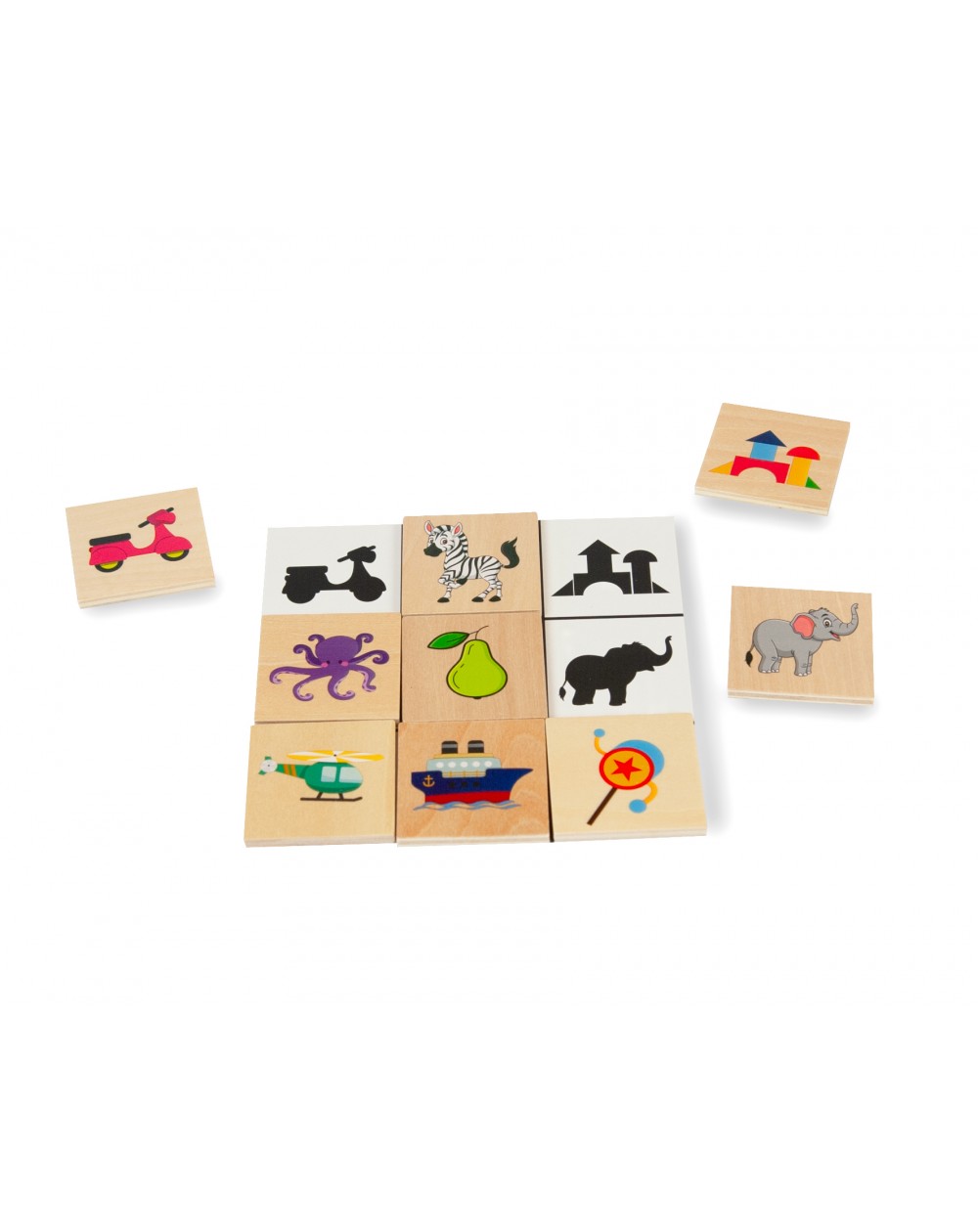 Combine as 45 peças de madeira com desenhos de animais, objetos, legumes, frutas, personagens, etc.
