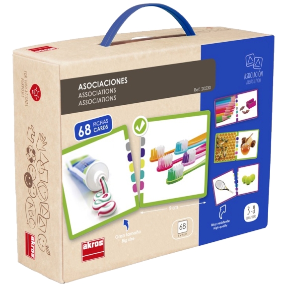Conteúdo: 68 fichas com imagens fotográficas que apresentam objetos, alimentos, peças de vestuário, mobiliário, instrumentos musicais, animais, etc; Caixa para arrumação do jogo; Instruções.