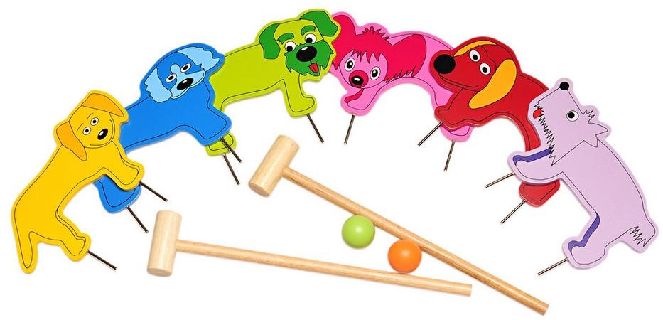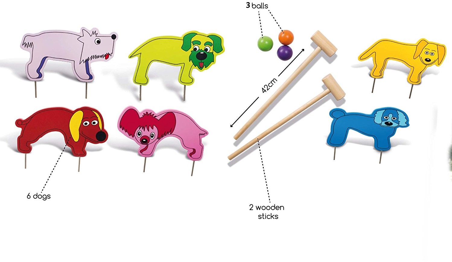Especificações: Cor: Multicor Sexo: Júnior Bola de material: bétula Cães de material: MDF Material adere: borracha-madeira Cães de dimensões: 26 x 19 cm Comprimento das varas: 42 cm Diâmetro da bola: 4,5 cm Idade: a partir dos 3 anos