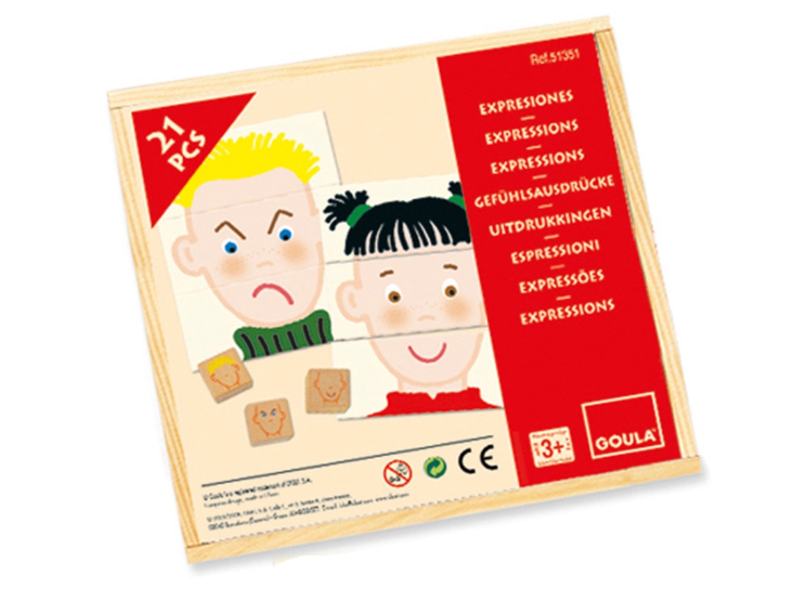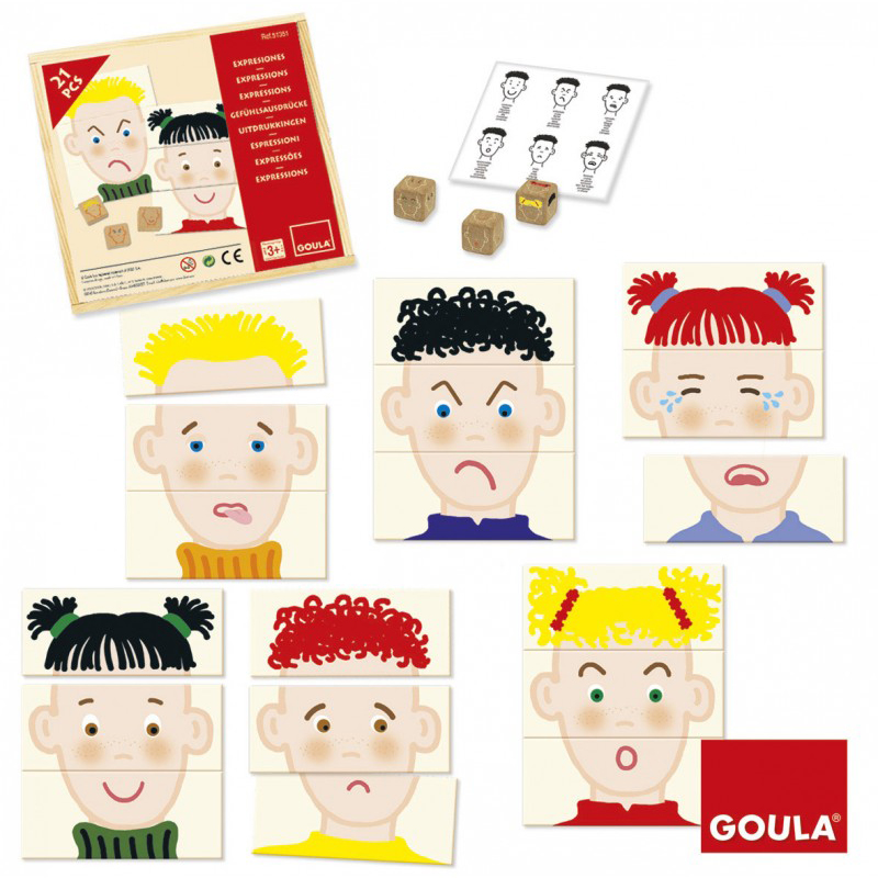 Descubra o Jogo de Expressões e Emoções da Goula, composto por 15 peças de madeira com características diferentes e 3 dados de madeira. Aprenda a identificar diferentes traços faciais e expressões, desenvolvendo a sua capacidade de observação e associação. Um divertido jogo de associação para toda a família que termina quando todas as expressões estiverem completas.