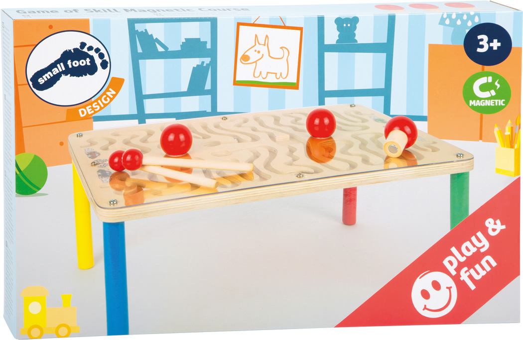 Para suas marcas, defina, vá! Quem passará pelo labirinto primeiro? Este jogo ensina habilidades motoras e concentração. O desafio é ser o primeiro a percorrer o labirinto, os diferentes comprimentos das hastes de madeira aumentam o grau de dificuldade. Para jogadores mais habilidosos, você pode seguir o curso começando de baixo, é assim que você joga quase "às cegas"! Corridas rápidas com hastes magnéticas e bolas de metal são divertidas e treinam habilidades motoras. Aqui dois jogadores se enfrentam. Quem será o primeiro a carregar as bolas magnéticas pelo campo de plástico em direção ao gol? O labirinto dentro da placa de madeira em camadas requer uma visão ampla, orientação e concentração. Varas de madeira curtas ou longas treinarão habilidades motoras Aprox. 40 x 17 x 28 cm