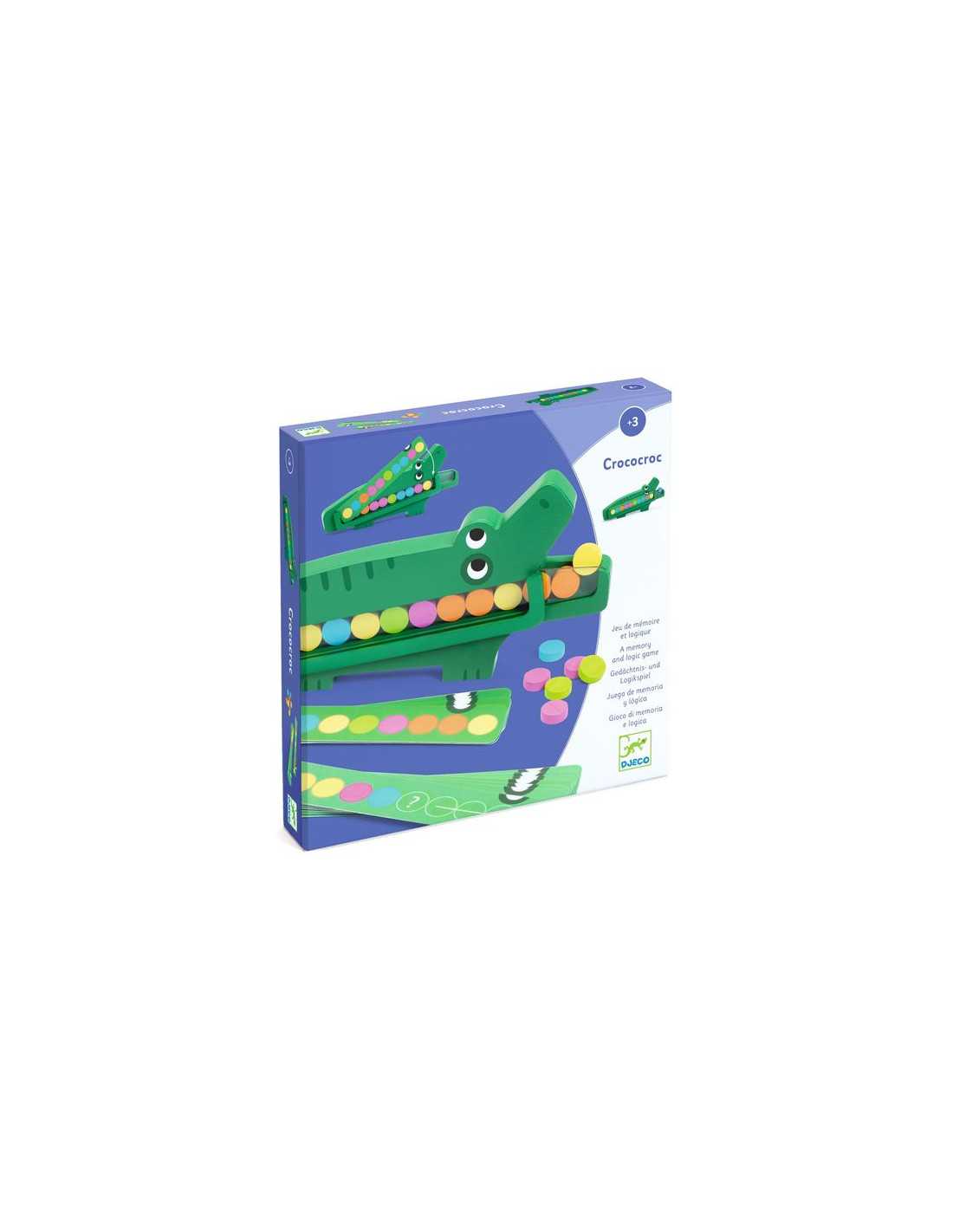 Inclui 1 crocodilo de madeira, 20 peças de jogo de madeira coloridas e 20 cartas. 21 x 10 x 2,5.