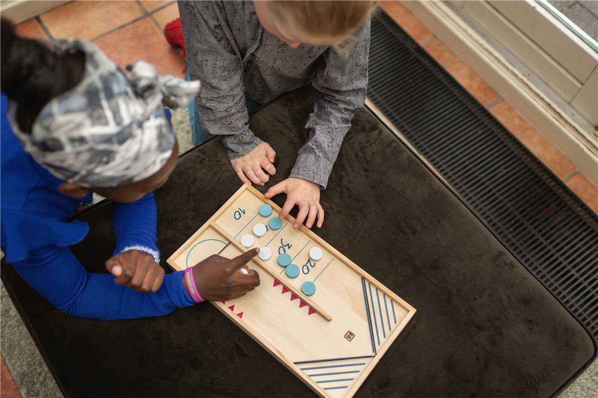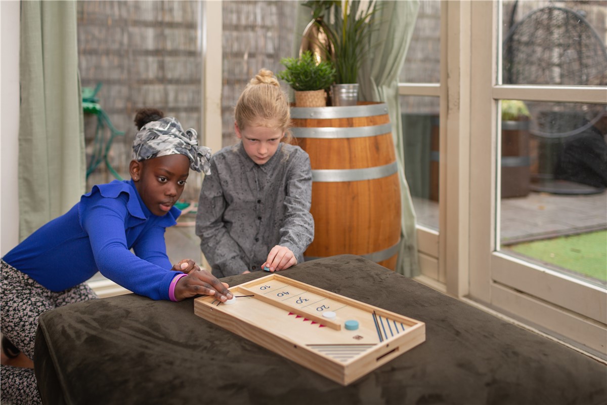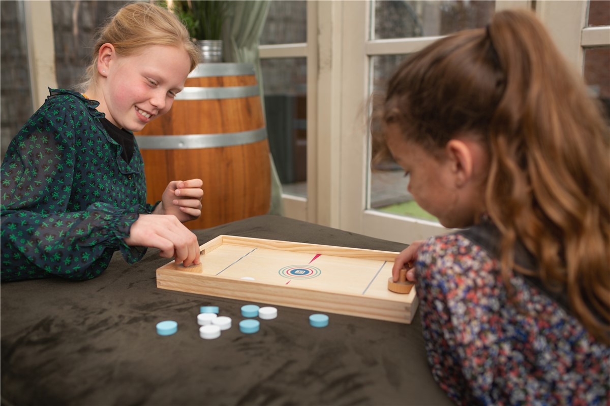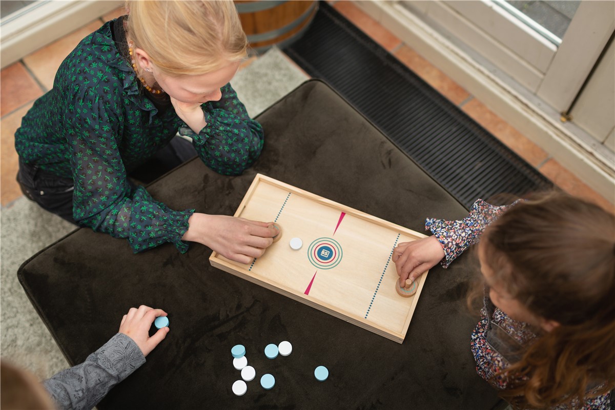 Jogue Sling Puck e tente marcar mais pontos jogando as fichas com o elástico e você também pode virar o tabuleiro e jogar hóquei de mesa.