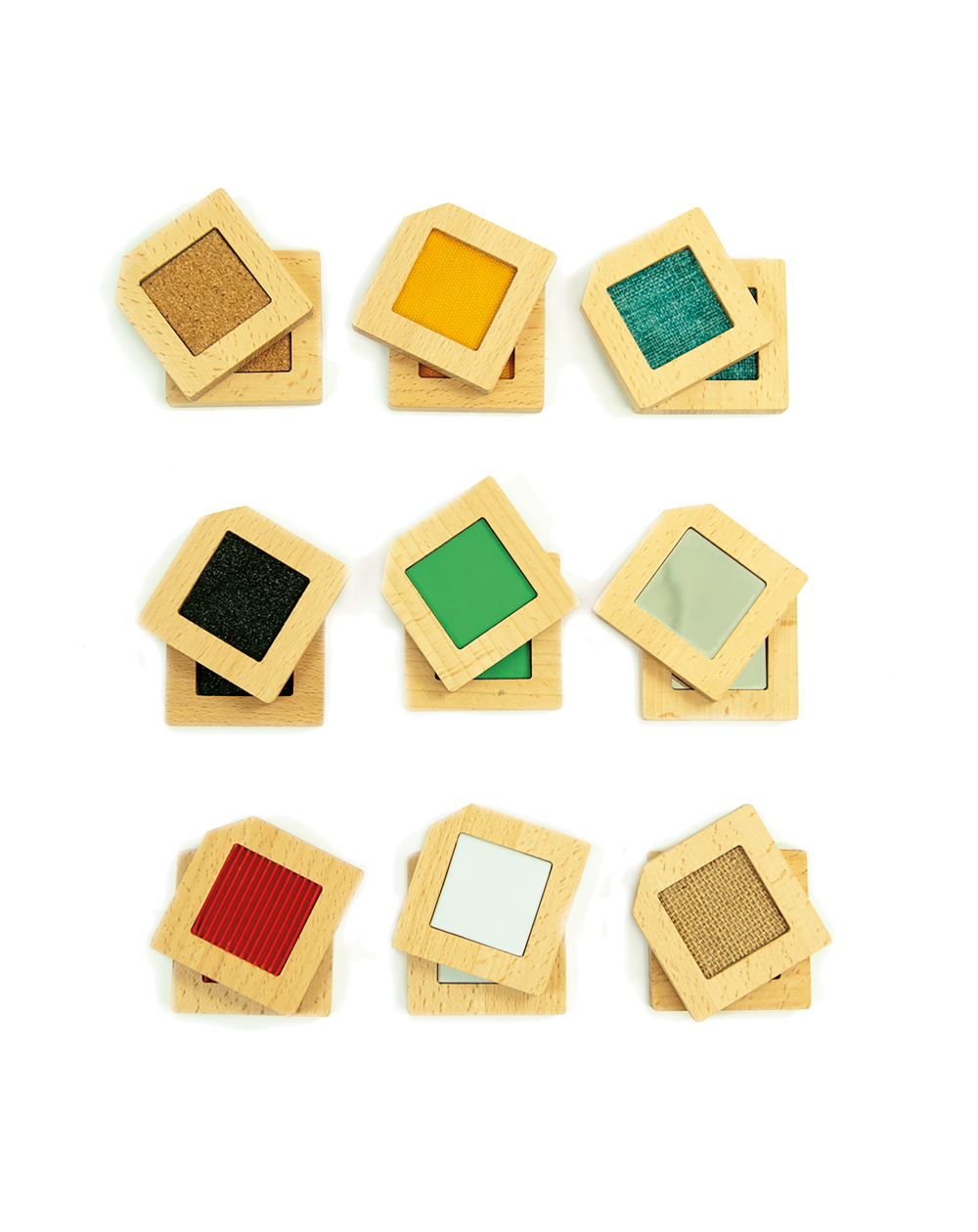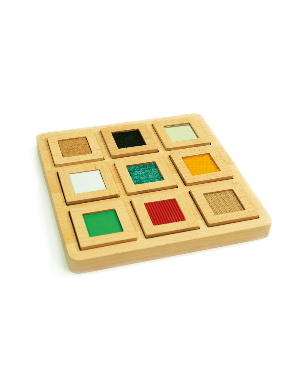 Utilize o tabuleiro para colocar, na ordem que preferir, as 9 peças com diferentes texturas sensoriais.