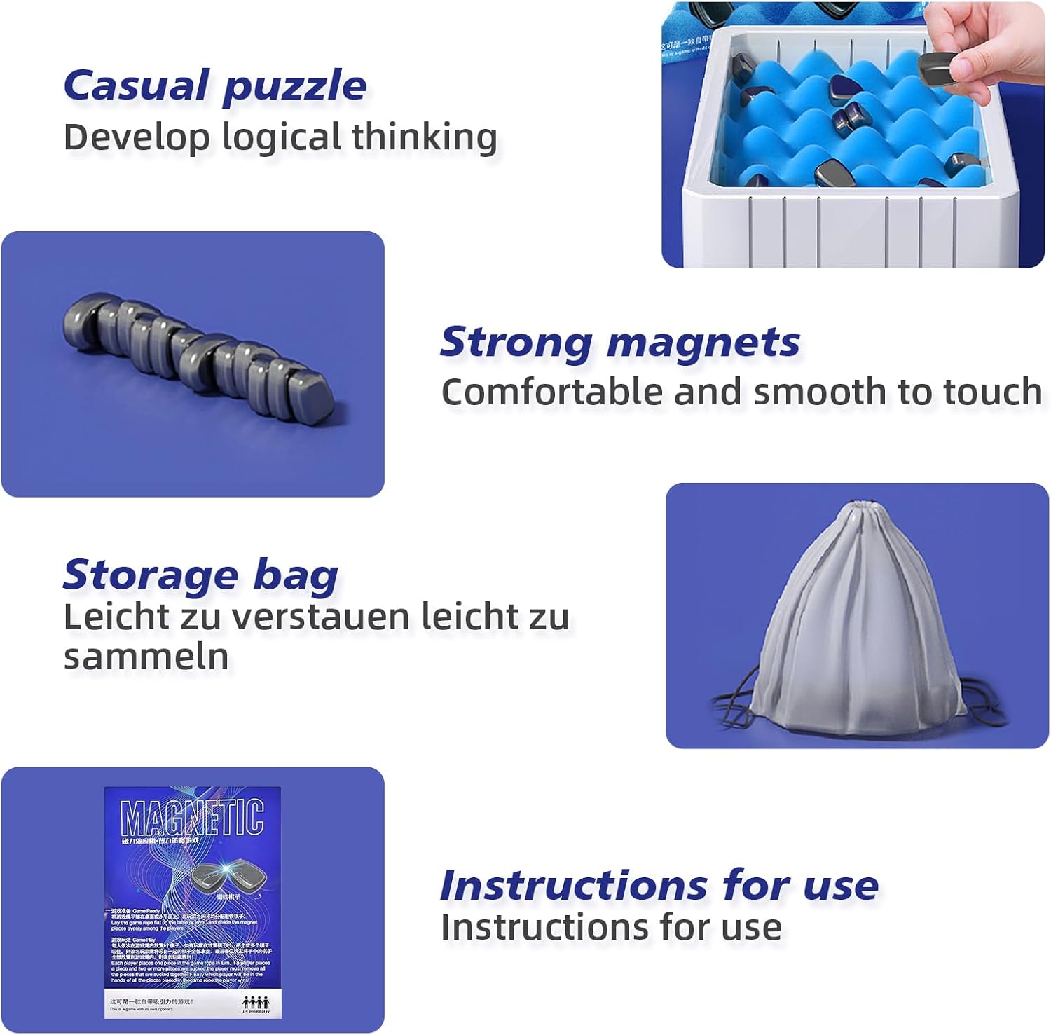 Pacote de xadrez magnético: o jogo de xadrez magnético contém 20 ímanes, 1 bolsa de armazenamento, 1 esponja de conjunto com caixa, 1 corda de jogo. O conjunto vem com duas opções de tabuleiro: um tabuleiro de xadrez de espuma macia e uma tábua circular de corda. Esta versatilidade permite que os jogadores escolham a sua interface de jogo favorita e proporciona variedade na ação do jogo