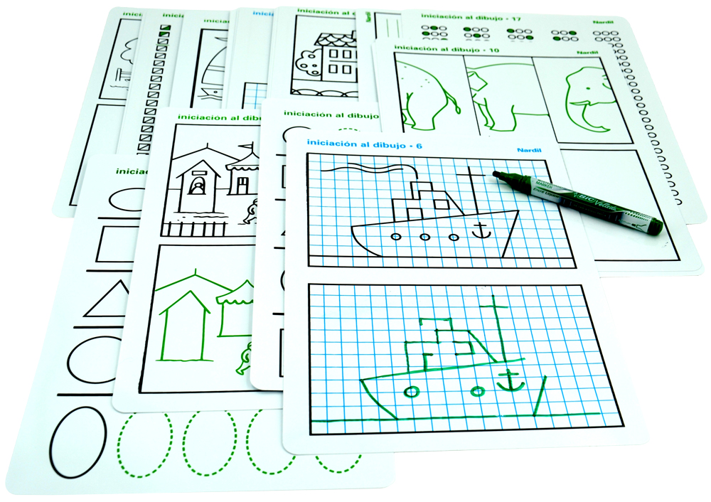 Desenhar ajuda as crianças a dominar a escrita. Usar um marcador apagável estimula o interesse delas em aprimorar a escrita. Elas desenham vários desenhos em diferentes escalas, com ajuda.