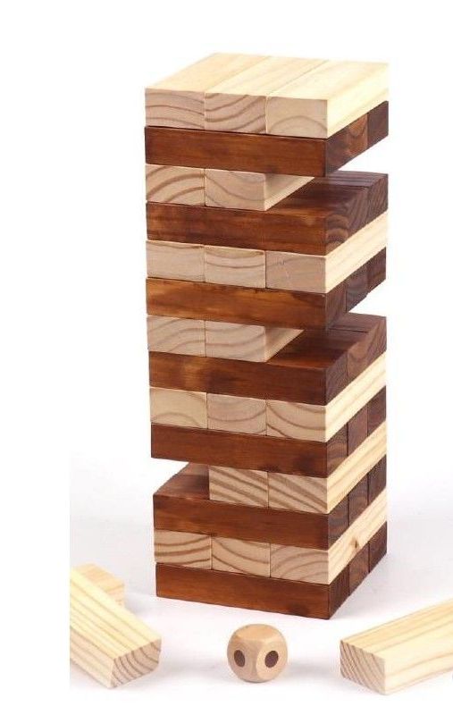 Feito de madeira em duas cores onde o dado decide a cor da peça que devemos retirar da torre para fazê-la crescer para cima.