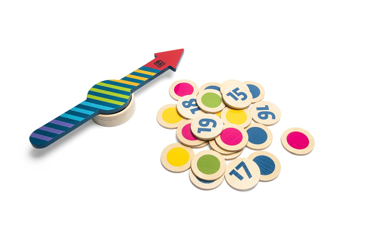 Madeira. Flecha: 35 x 9 x 4 cm. | 24 fichas de 6 cm. diâmetro x 0,5 cm.