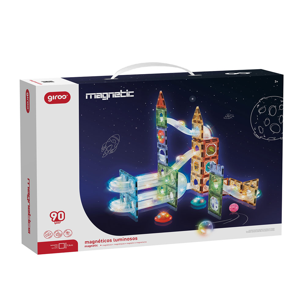 Jogo Magnético Luminoso de 90 peças com tubos, bolas e Formas magnéticas 3D STEAM Estimula a imaginação recriando conexões infinitas com formas magnéticas de várias cores de 7,5cm polarizadas. A brincar, a criança descobre conceitos essenciais e comuns a diversas ciências.