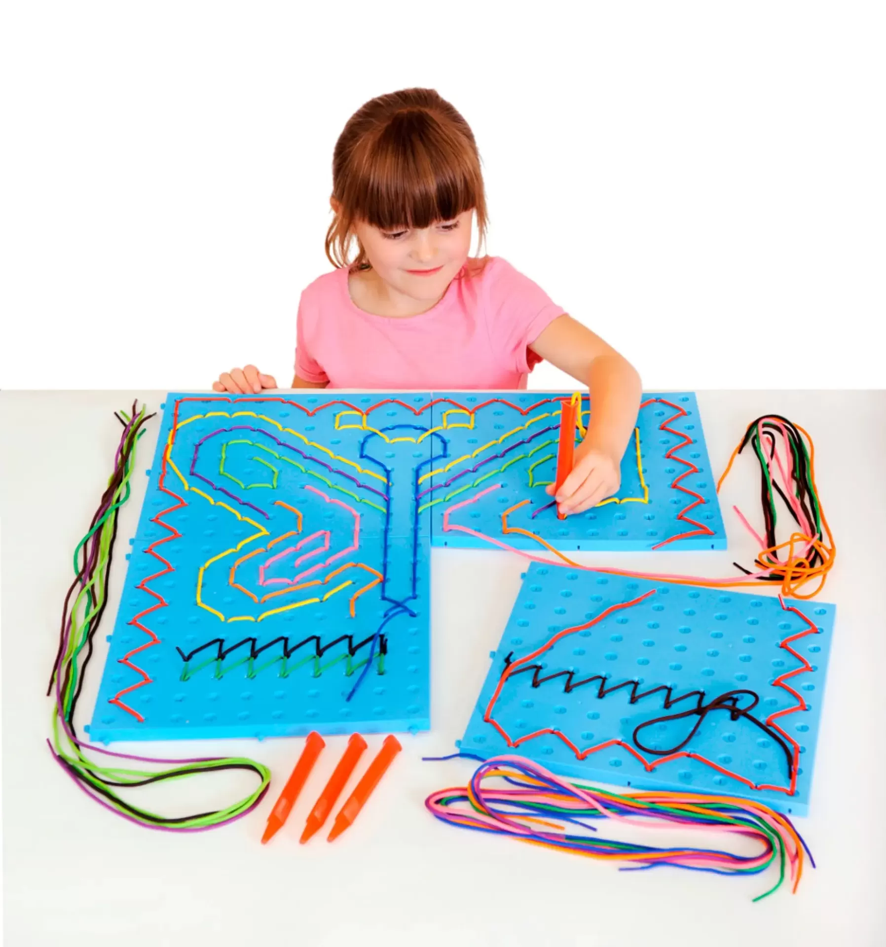 Conteúdo: 4 placas (28x28cm), 4 aplicadores triangulares e 10 cordões coloridos.