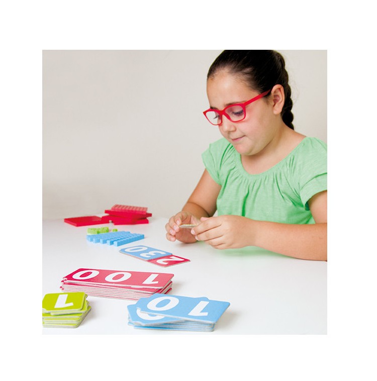 Um conjunto que representa números longos de 1 a 999 com material de manipulação de base 10. As cartas numéricas são reversíveis: o verso mostra a mesma quantidade que a frente, mas na forma de blocos de base 10. Inspirado na metodologia Montessori. O que eu aprendo? O que eu aprendo?