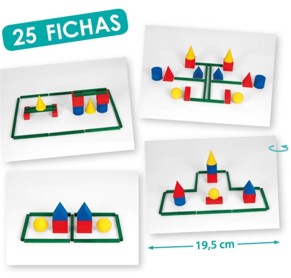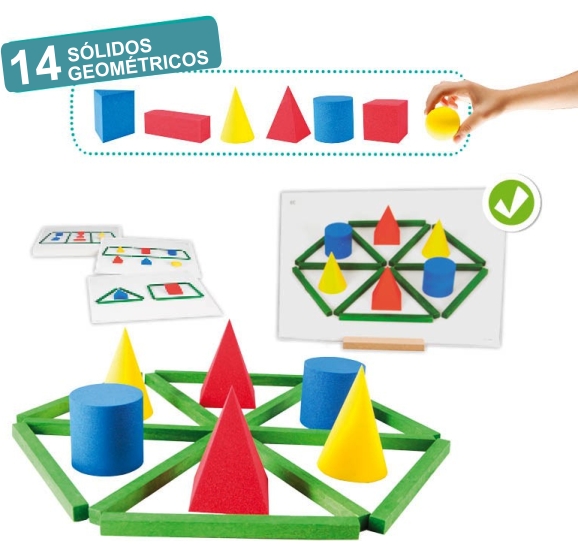 Conteúdo: 14 formas geométricas sólidas (2 conjuntos de 7 sólidos); 15 barras; 50 fotografias modelo; 2 sacos opacos (para trabalhar o tato); Mala em plástico para arrumação do jogo; Instruções incluindo sugestões de atividades.