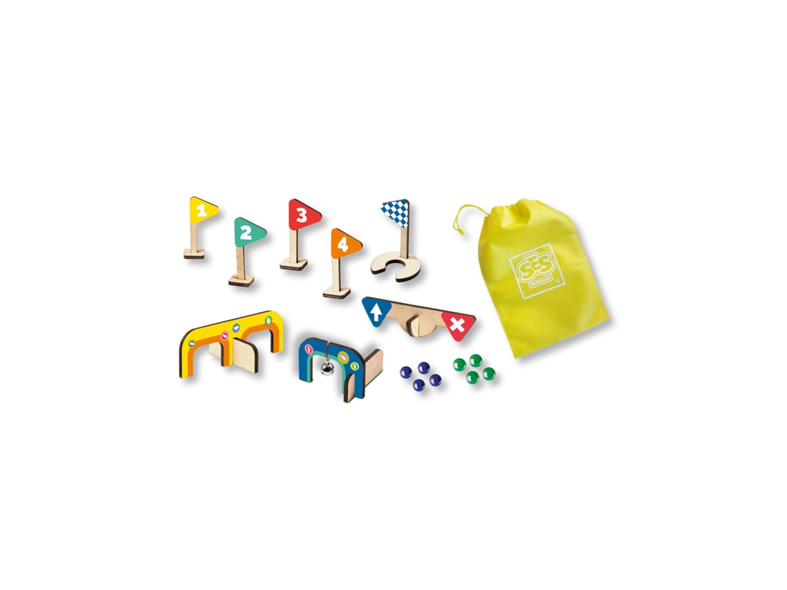 O conjunto de golfe de mármore - campo de minigolfe de madeira contém oito berlindes, um campo de golfe de madeira, um sino, elástico e uma bolsa de armazenamento.
