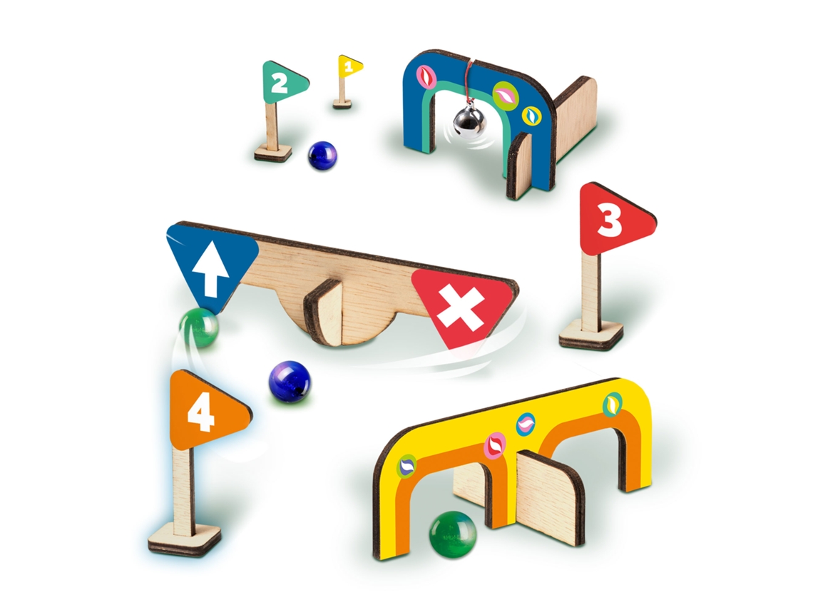 O conjunto contém obstáculos de madeira e oito berlindes. coloque os obstáculos onde quiser e comece o jogo! quem ganhará?