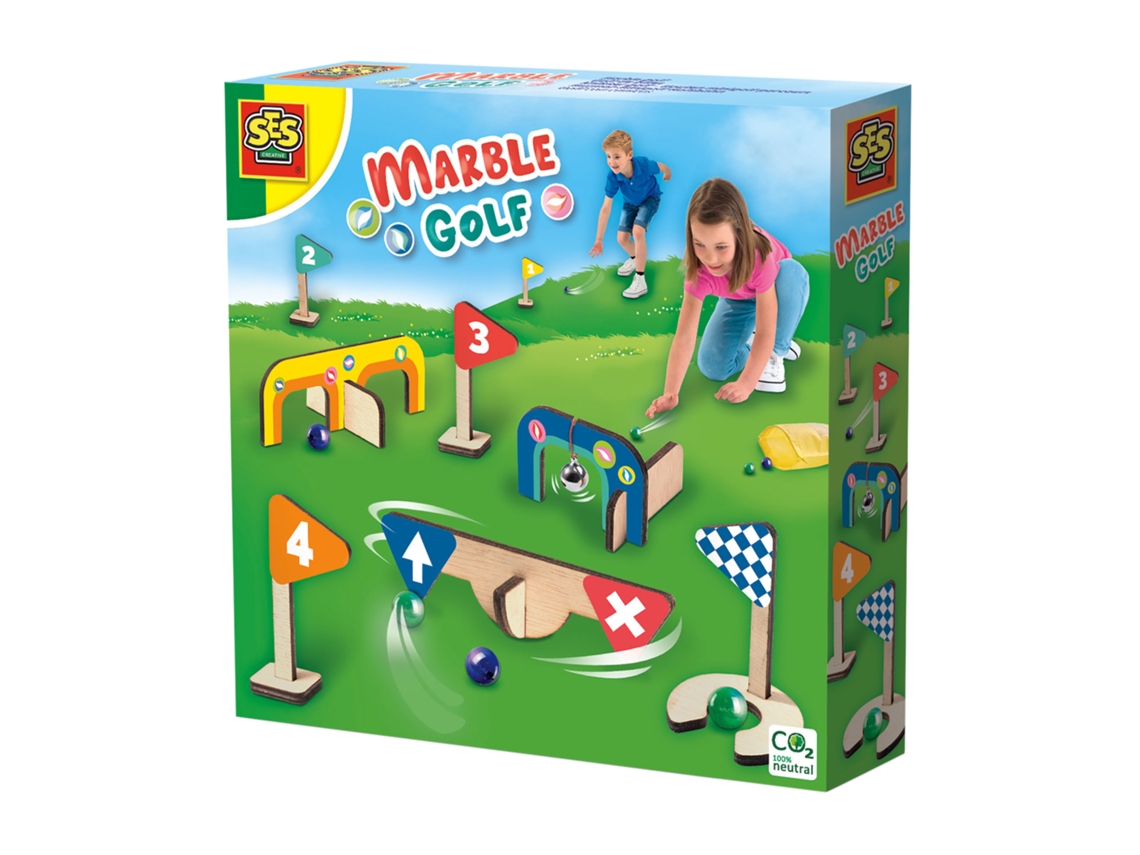 Com este extenso campo de minigolfe com berlindes, podes divertir-te sem parar!