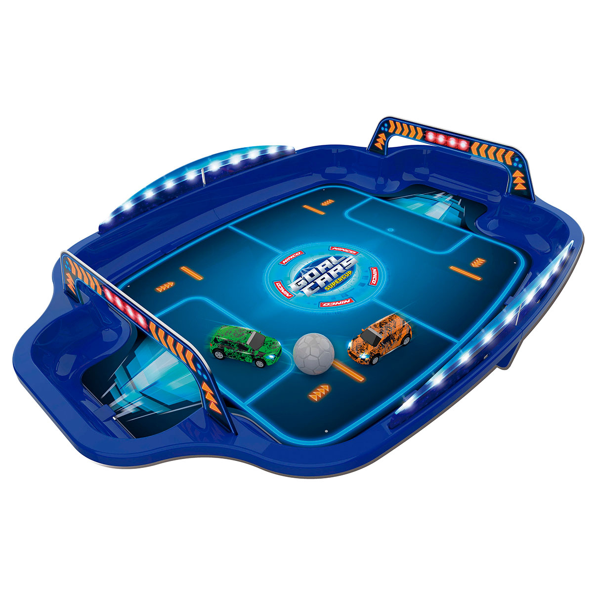 A experiência completa-se com o estádio Goal Cars Supercup. Trata-se de um cenário de jogo semiesférico, desmontável e com um design totalmente futurista. Com um tamanho de 70 x 50 cm, este campo de jogo permite que os carros de controlo remoto se movam livremente, recriando uma verdadeira competição de futebol.