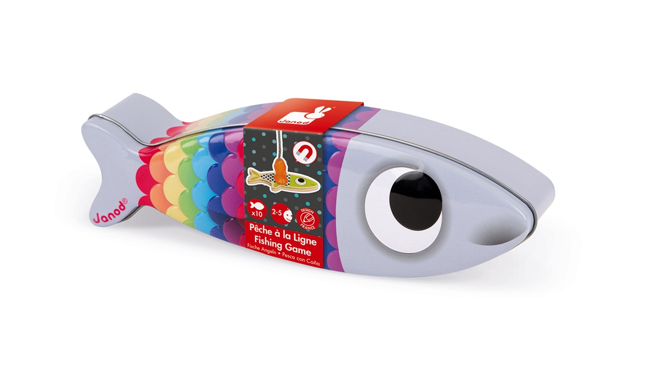 Jogo de pesca à vara composto por 10 sardinhas coloridas divertidas e 2 varas de pesca de madeira com um anzol de plástico em forma de peixe.