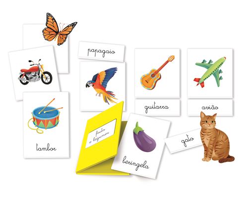 Este jogo, inspirado na atividade montessoriana da nomenclatura, convida a criança a fazer a correspondência das cartas com as imagens aos cartões com as palavras correspondentes.