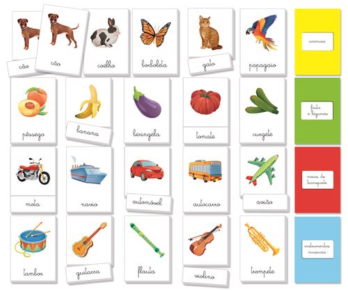 Contém também pastas de classificação para as palavras de acordo com os contextos a que pertencem: animais, instrumentos musicais, fruta e legumes, meios de transporte.