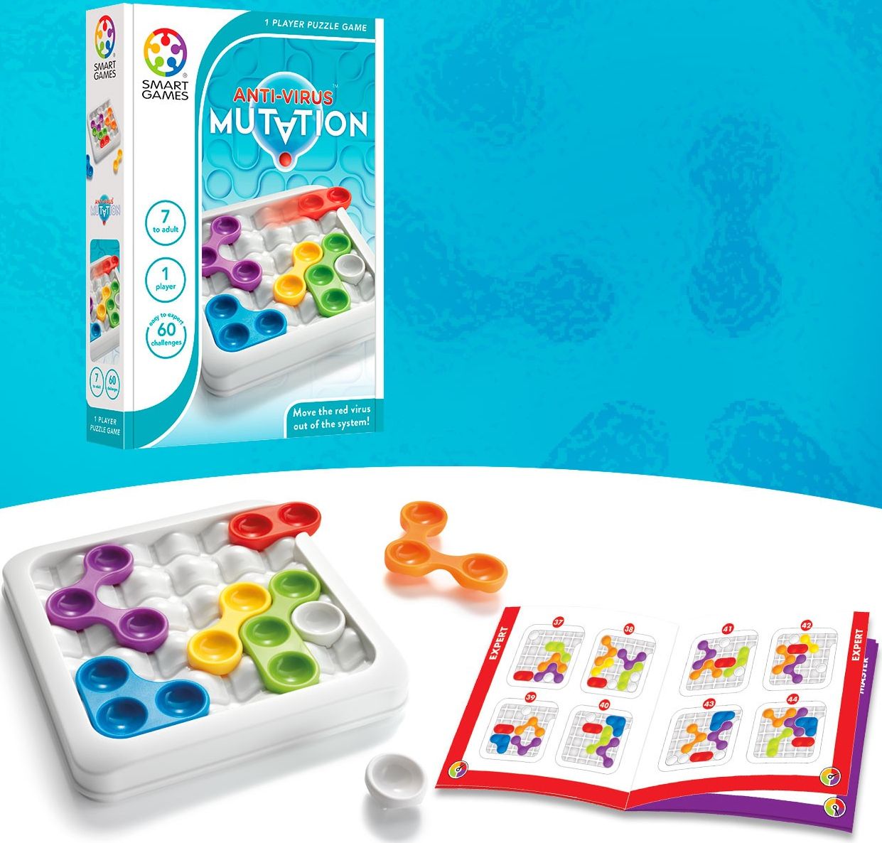 Para isso têm que fazer deslizar todas as peças coloridas que existem no tabuleiro, para limpar o caminho e remover totalmente o vírus vermelho. Este é um ótimo jogo de viagem que apresenta 60 desafios e com diferentes níveis de dificuldade. Além disto o tabuleiro de jogo transforma-se numa caixa para transportar o jogo para qualquer lugar.
