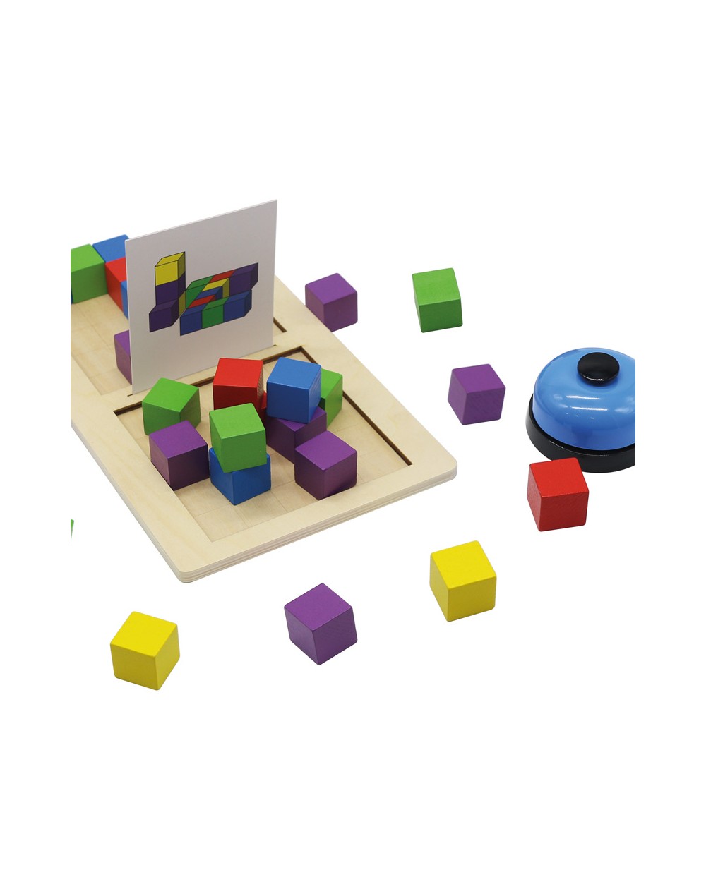 Inclui um tabuleiro de jogo em madeira, 40 cubos de madeira coloridos de 2,5x2,5cm, 36 cartas frente e verso e um saco de pano para guardar as peças.